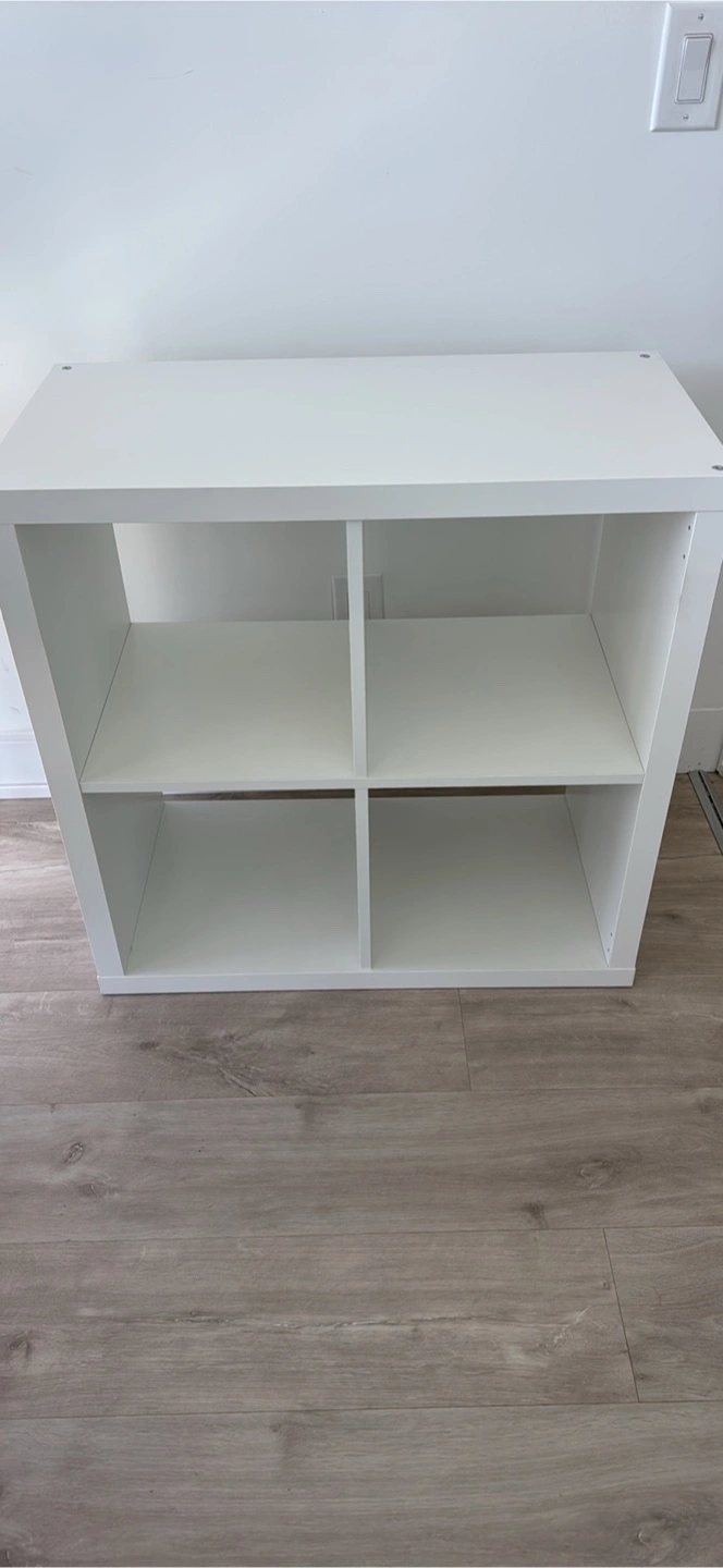 White Kallax shelving unit. Four cube shelving unit. Excellent condition. Easy to assemble and disassemble.