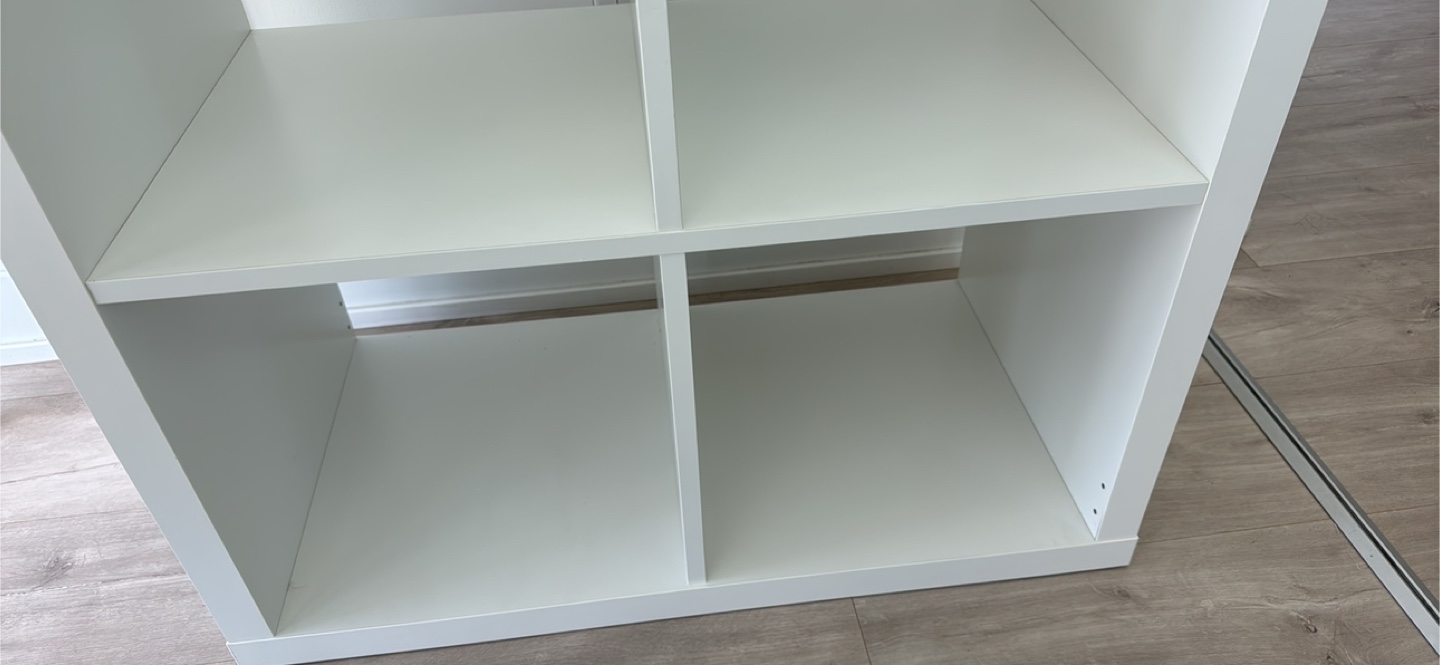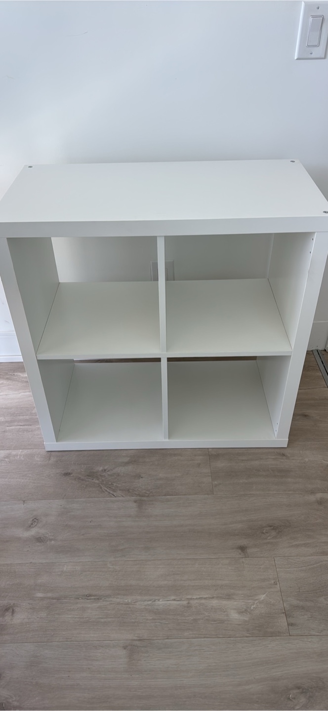 White Kallax shelving unit. Four cube shelving unit. Excellent condition. Easy to assemble and disassemble.