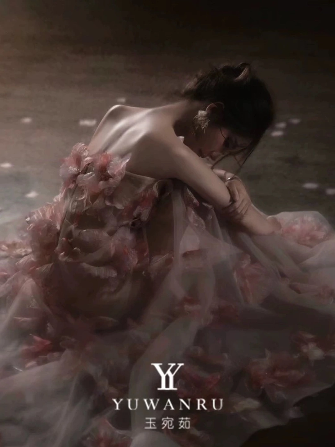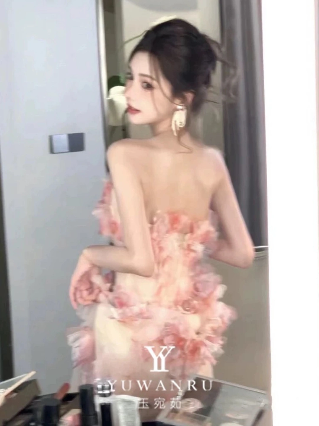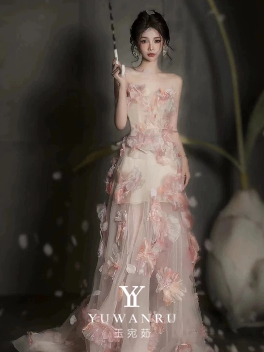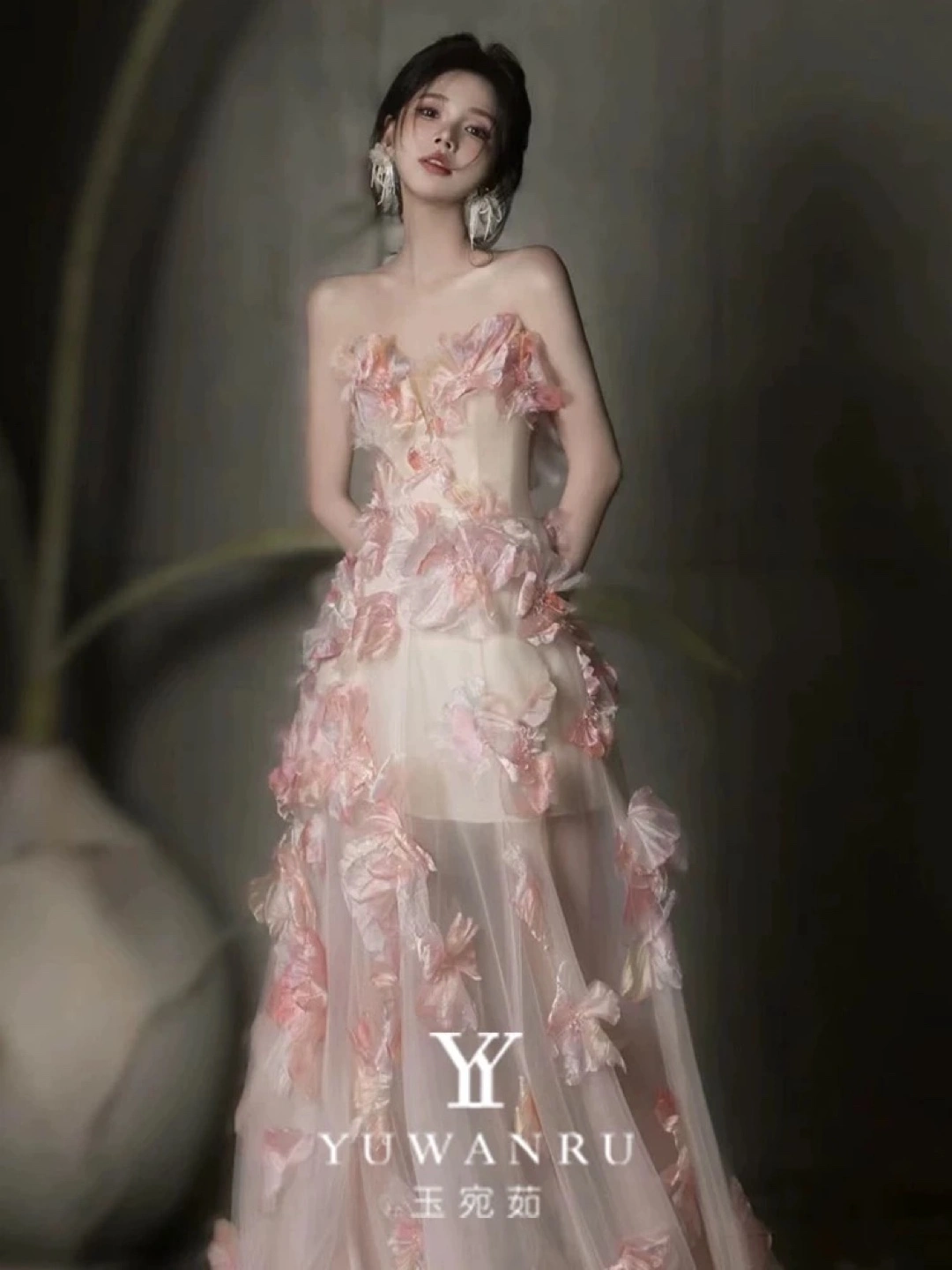 10Stunning strapless gown in neutral hues, embellished with delicate flower appliqués. A floor-length silhouette with layers of flowing fabric. Imagine yourself wearing it to a special occasion, it would be a showstopper for sure.