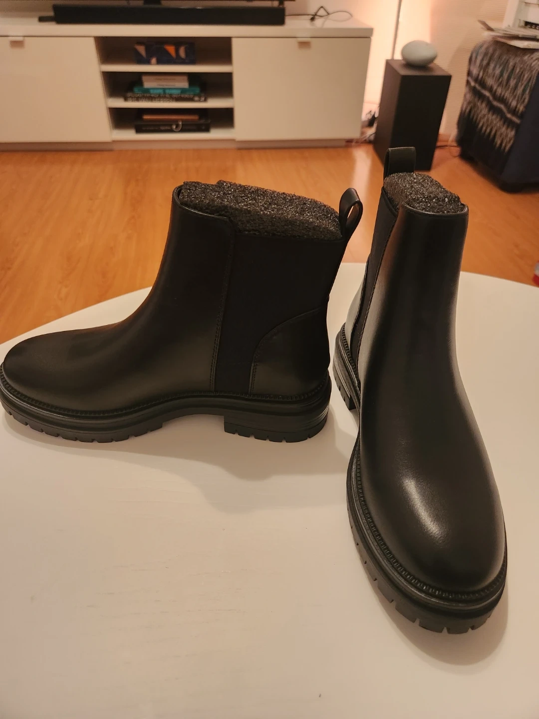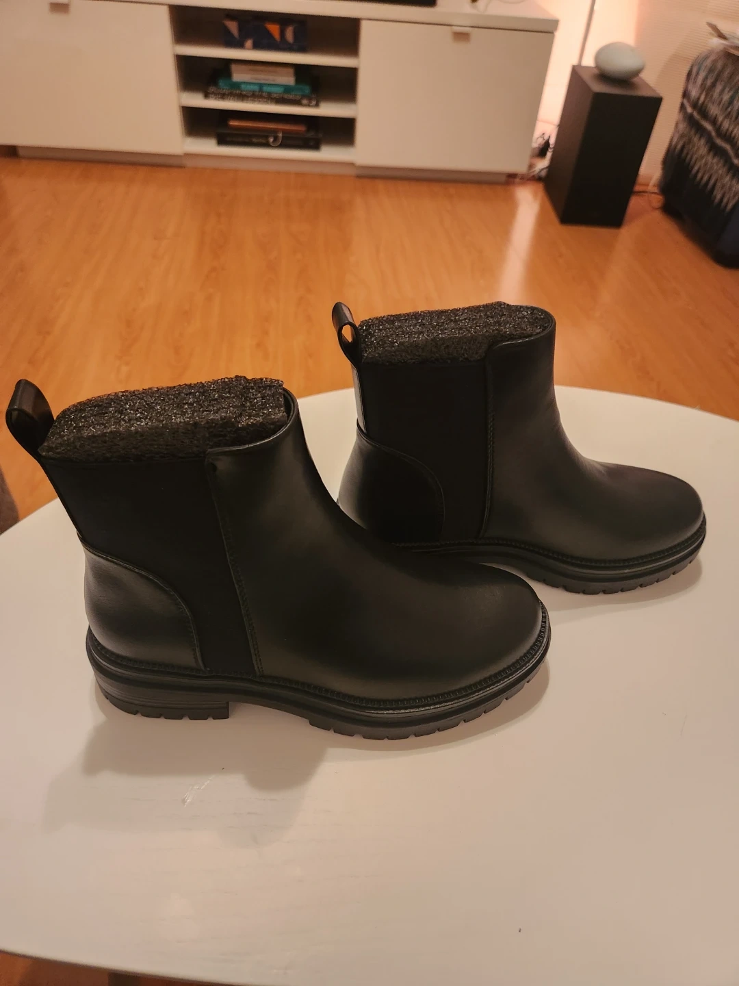 Never worn. Black pull-on ankle boots with a smooth man-made upper, lining, and sole. Comfortable 1.5” heel with chunky sole. Stylish, versatile, and easy to wear. Imported.