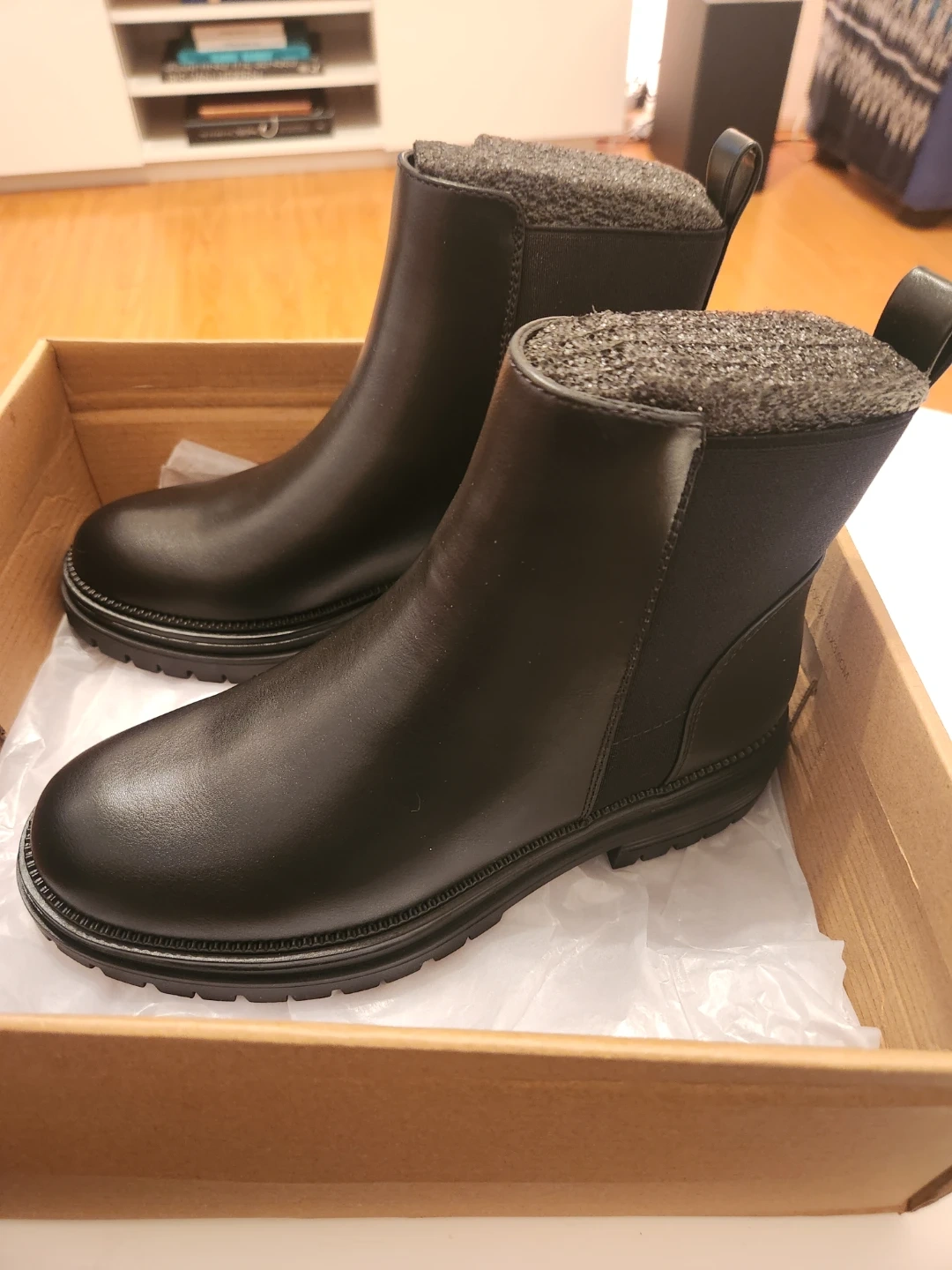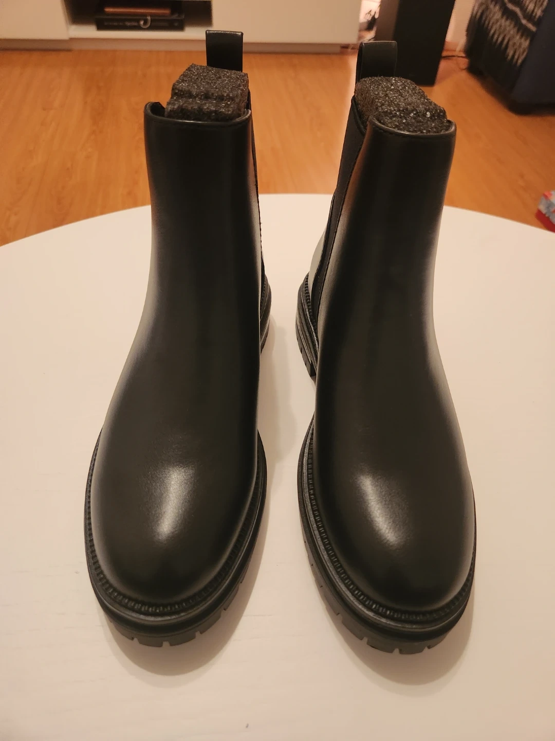Never worn. Black pull-on ankle boots with a smooth man-made upper, lining, and sole. Comfortable 1.5” heel with chunky sole. Stylish, versatile, and easy to wear. Imported.