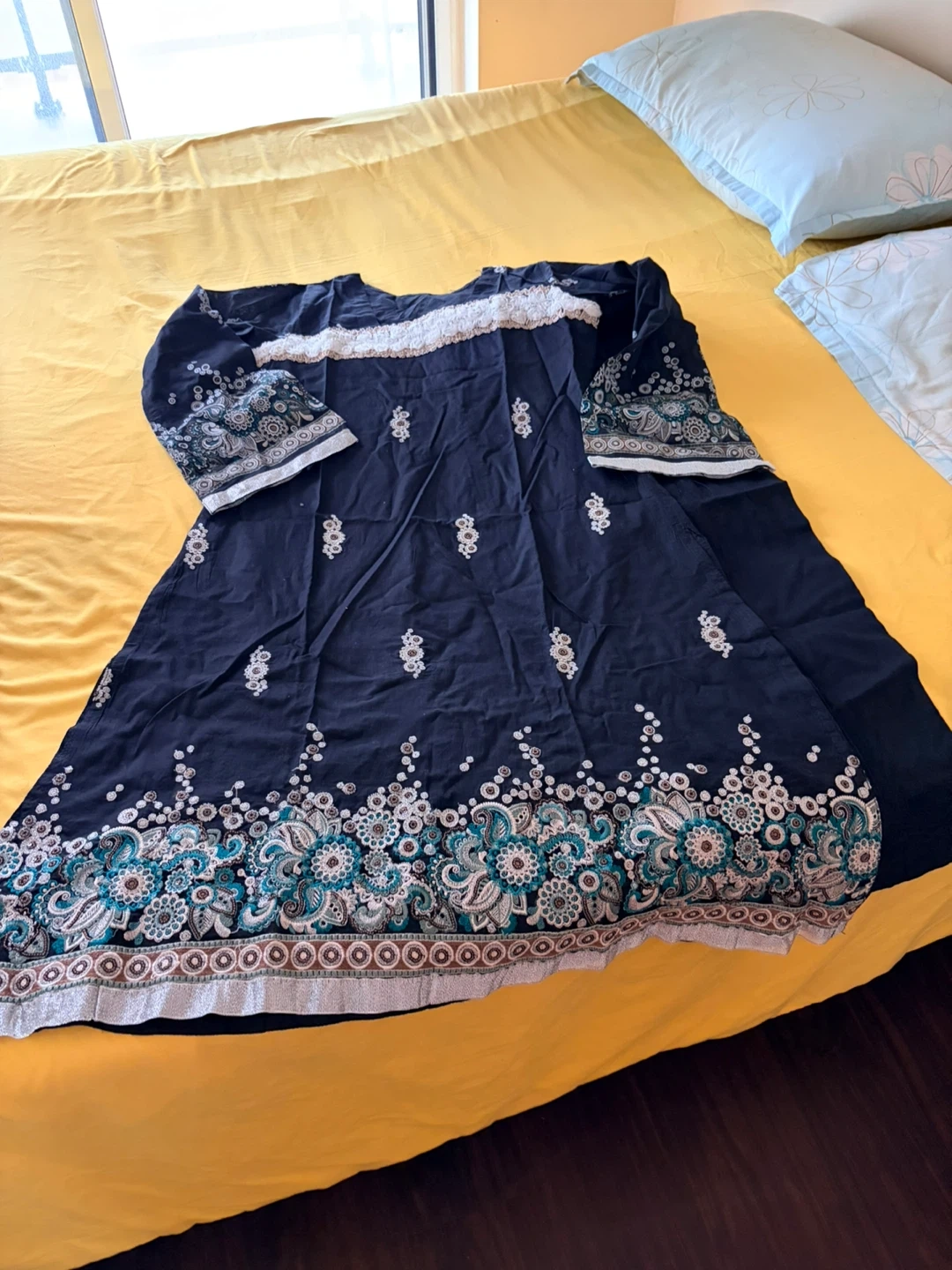 A lovely black A line shirt and trouser featuring intricate white and teal embroidery. It has a decorative white lace trim along the neckline and sleeves. The hem is adorned with a beautiful, detailed floral and paisley border pattern. Made from a soft fabric, this outfit is perfect for casual wear or festive occasions.
