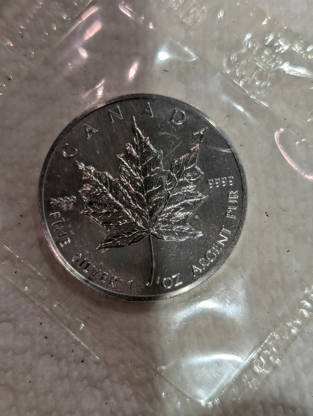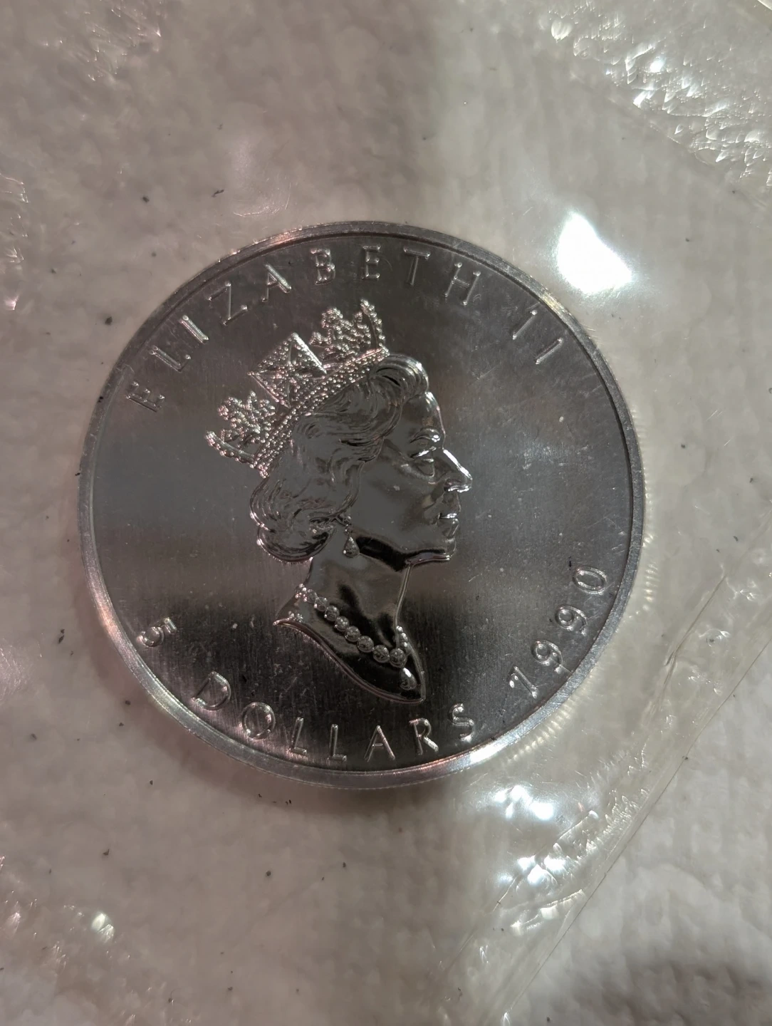 Selling a 5 Dollars 1990 Canadian Silver Maple Leaf coin. It's 1 oz of .9999 fine silver. Features Queen Elizabeth II on one side and a maple leaf on the other