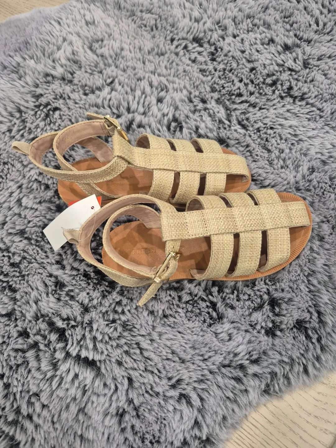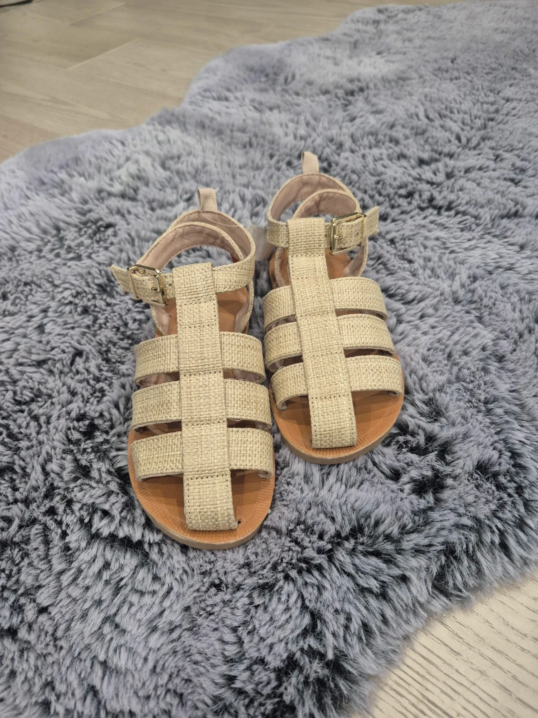 These cute beige woven gladiator sandals are perfect for warm weather. They feature a secure buckle closure and a comfortable tan sole. Great for everyday wear!