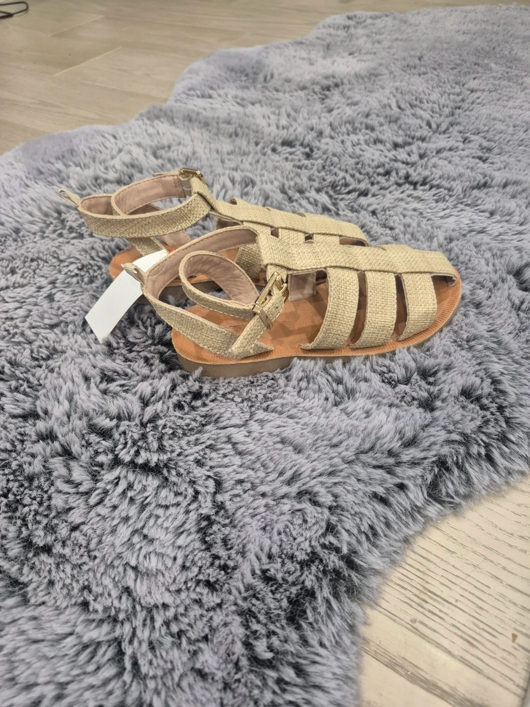 These cute beige woven gladiator sandals are perfect for warm weather. They feature a secure buckle closure and a comfortable tan sole. Great for everyday wear!