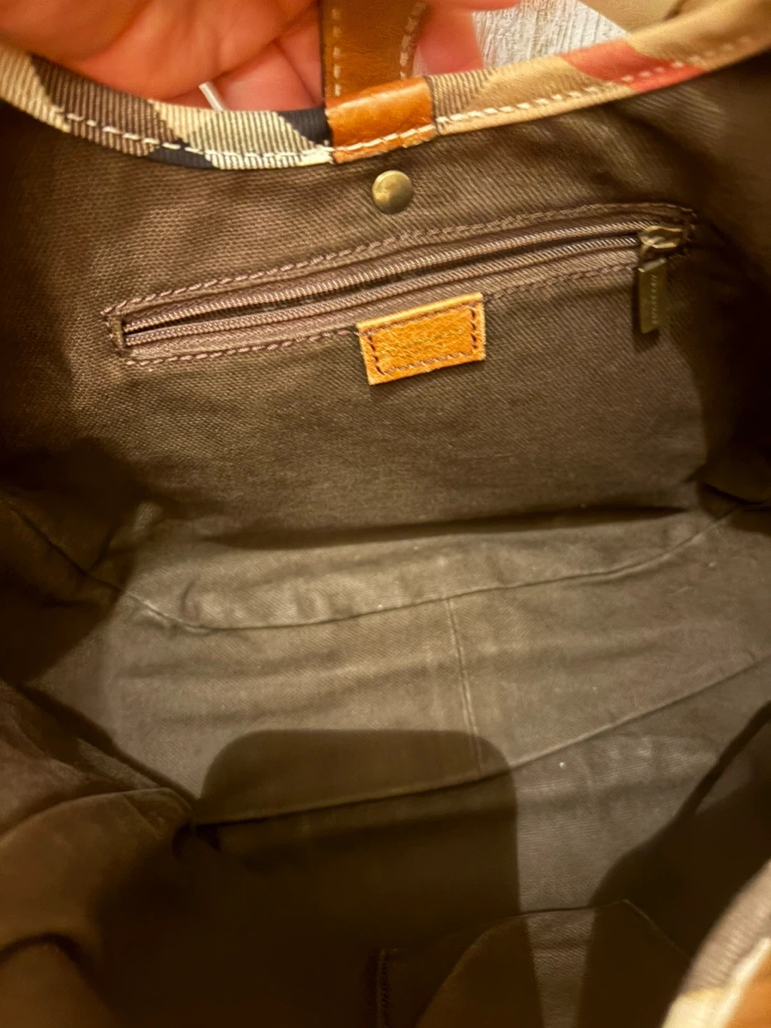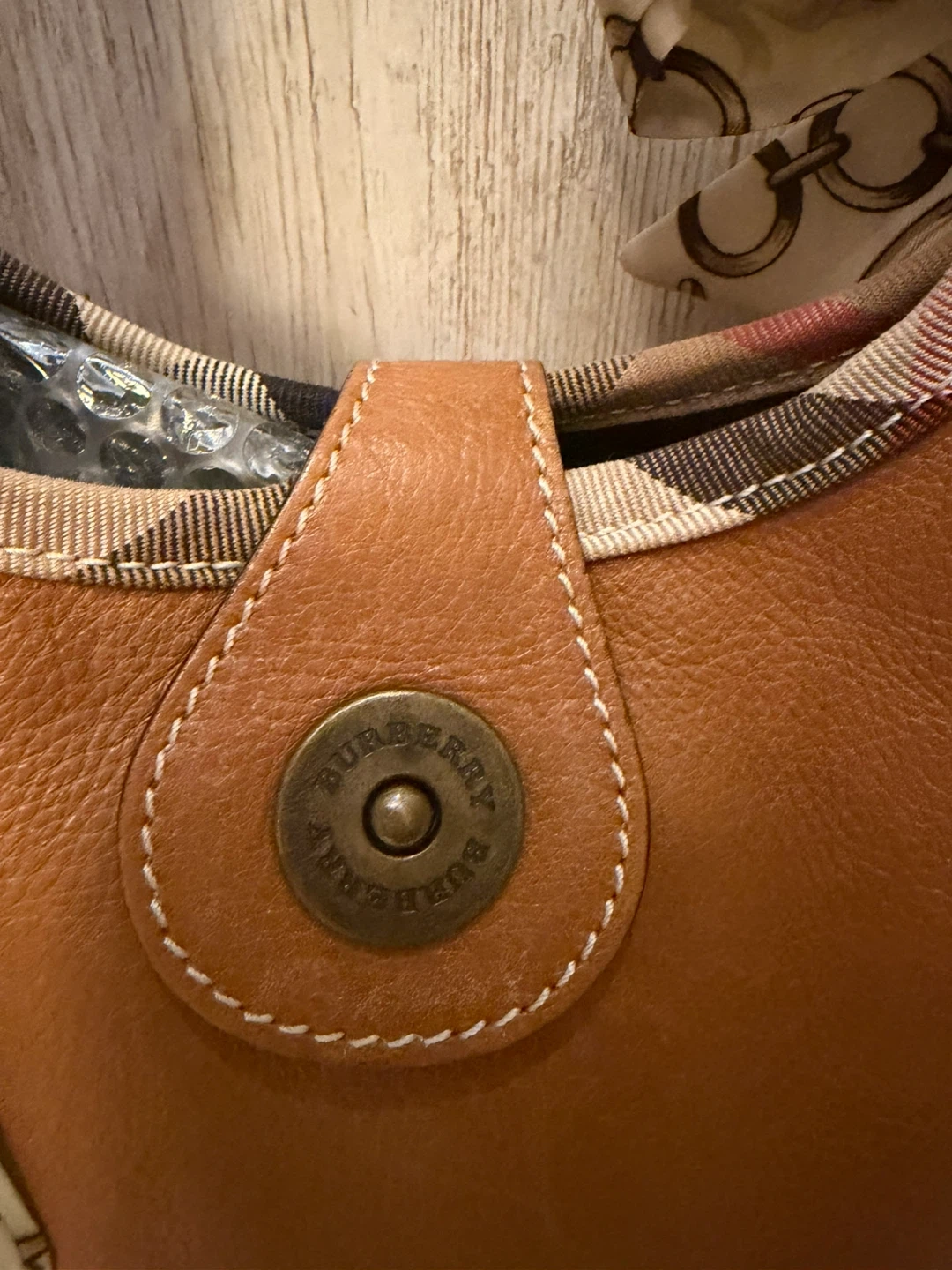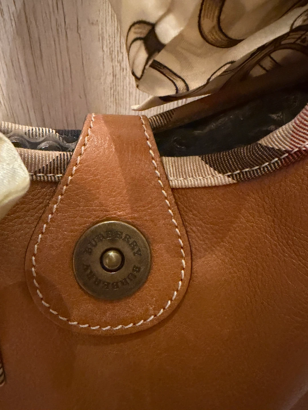 This is a Burberry tote bag made from tan leather. It features the iconic Burberry dark brown lining and comes with a decorative scarf tie. Snap closure. Very clean and EUC . Complimentary tiwllies and tazzle . Water mark on bottom of the purse around not noticeable because of the leather color . I can send video