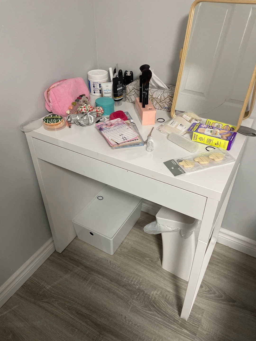 A compact white corner vanity desk. It's perfect for smaller spaces or a dedicated makeup area. Some makeup and accessories are visible on top, but the desk itself is the item for sale.