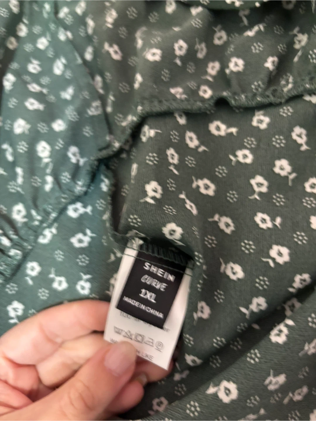 This SHEIN Curve dress has a dark green base with a white floral print. It features a V-neck and short, ruffled sleeves. Made in China. Size 1XL.