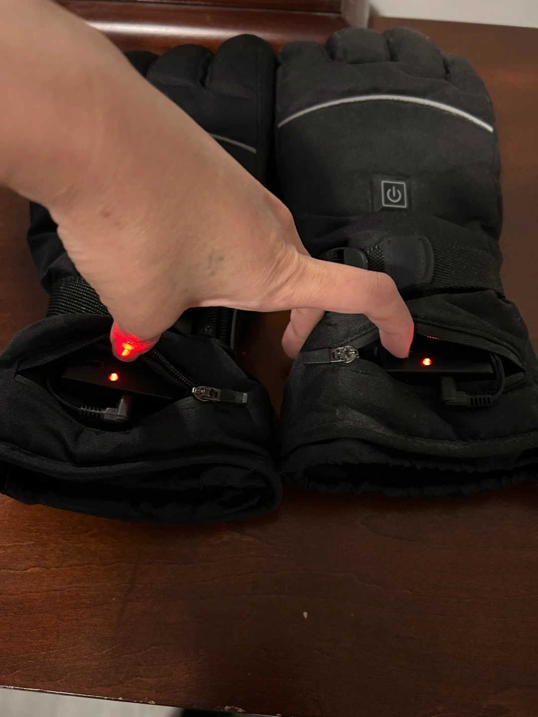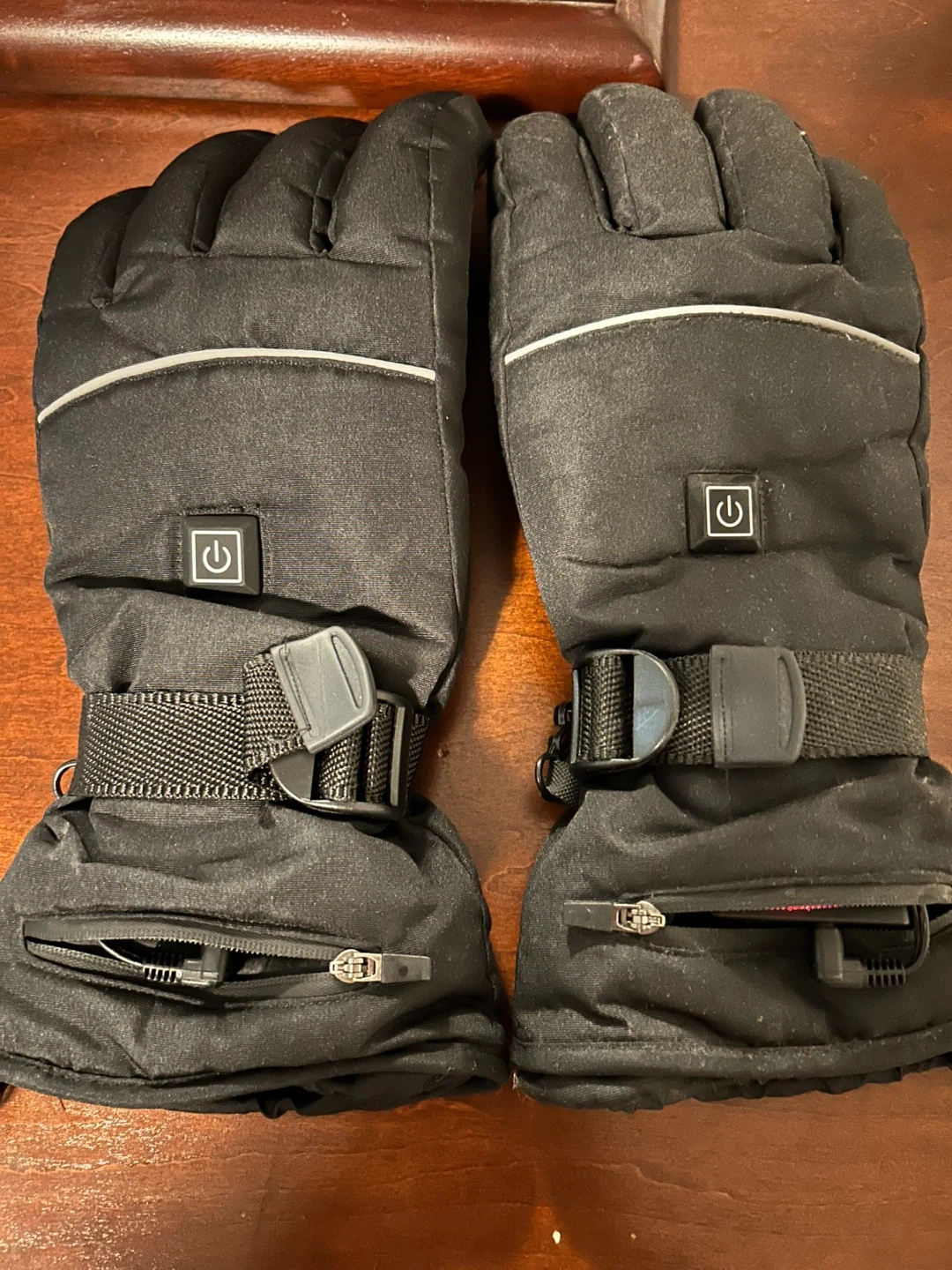 These black heated gloves feature a power button with an indicator light. They come with adjustable straps and zippered pockets for convenience. Great for keeping your hands warm on chilly days!