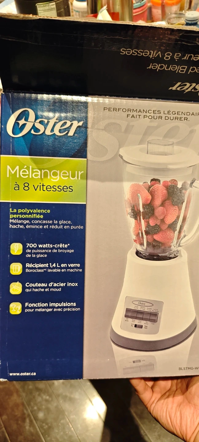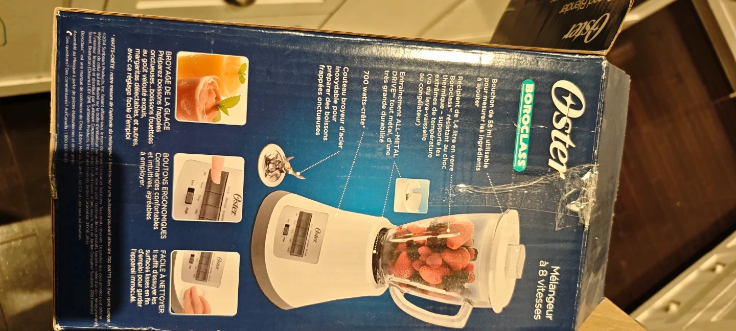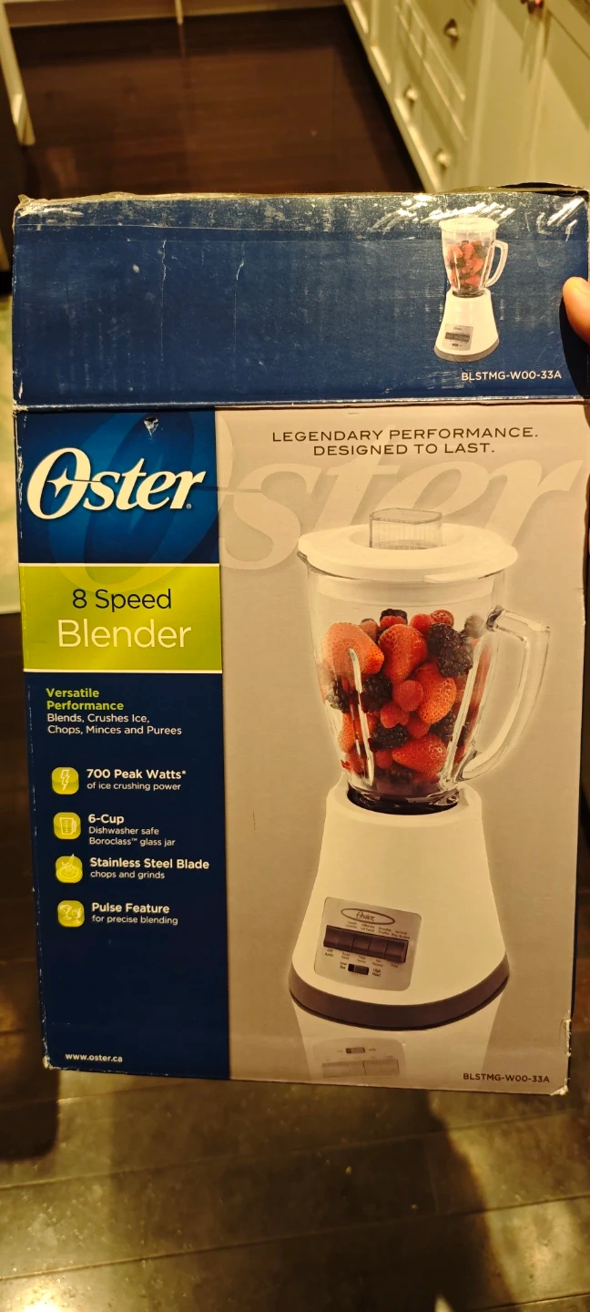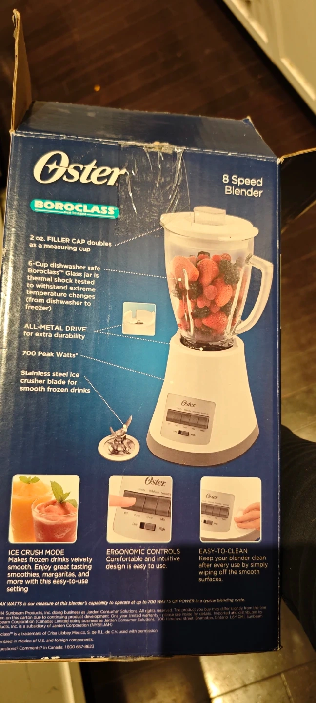 This Oster 8 Speed Blender features a Boroclass glass jar and an all-metal drive for durability. It has 700 peak watts and a 6-cup dishwasher-safe jar. Perfect for making smoothies and frozen drinks!