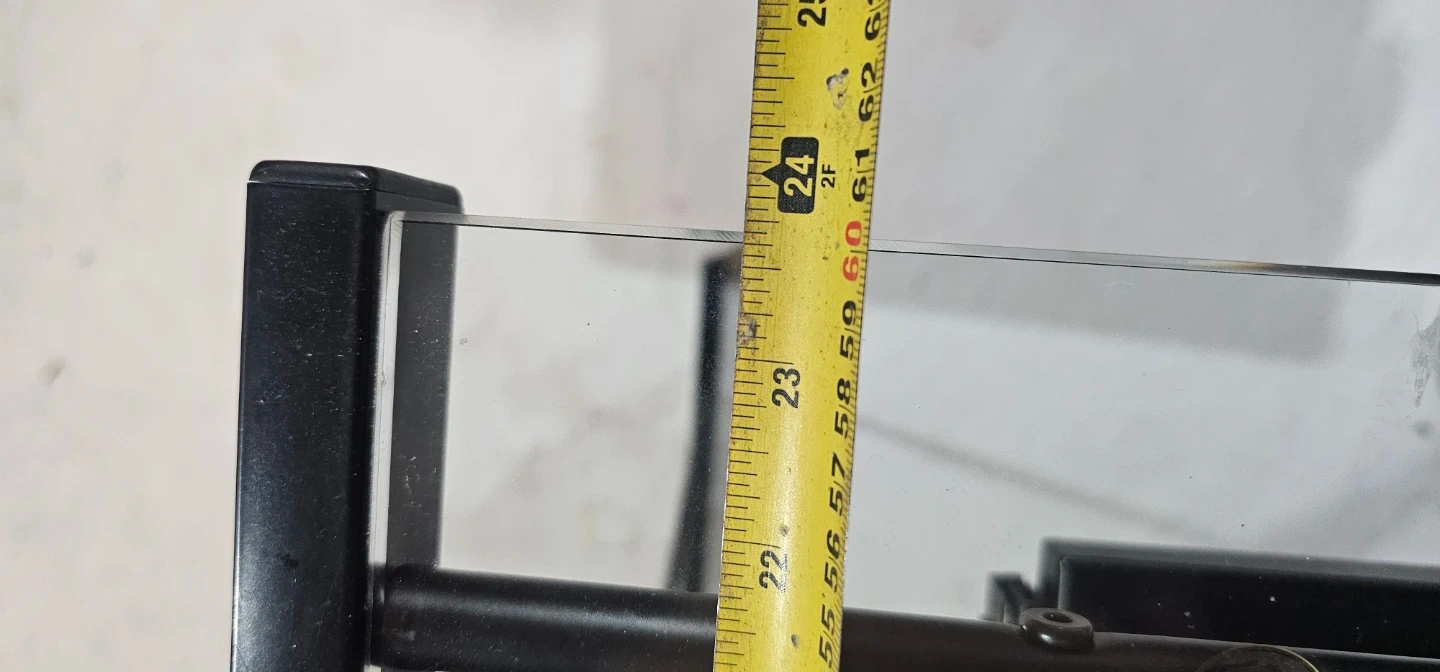 This desk features a clear glass top and a black metal frame. It includes a pull-out keyboard tray for added convenience. The desk is 29 inches high.