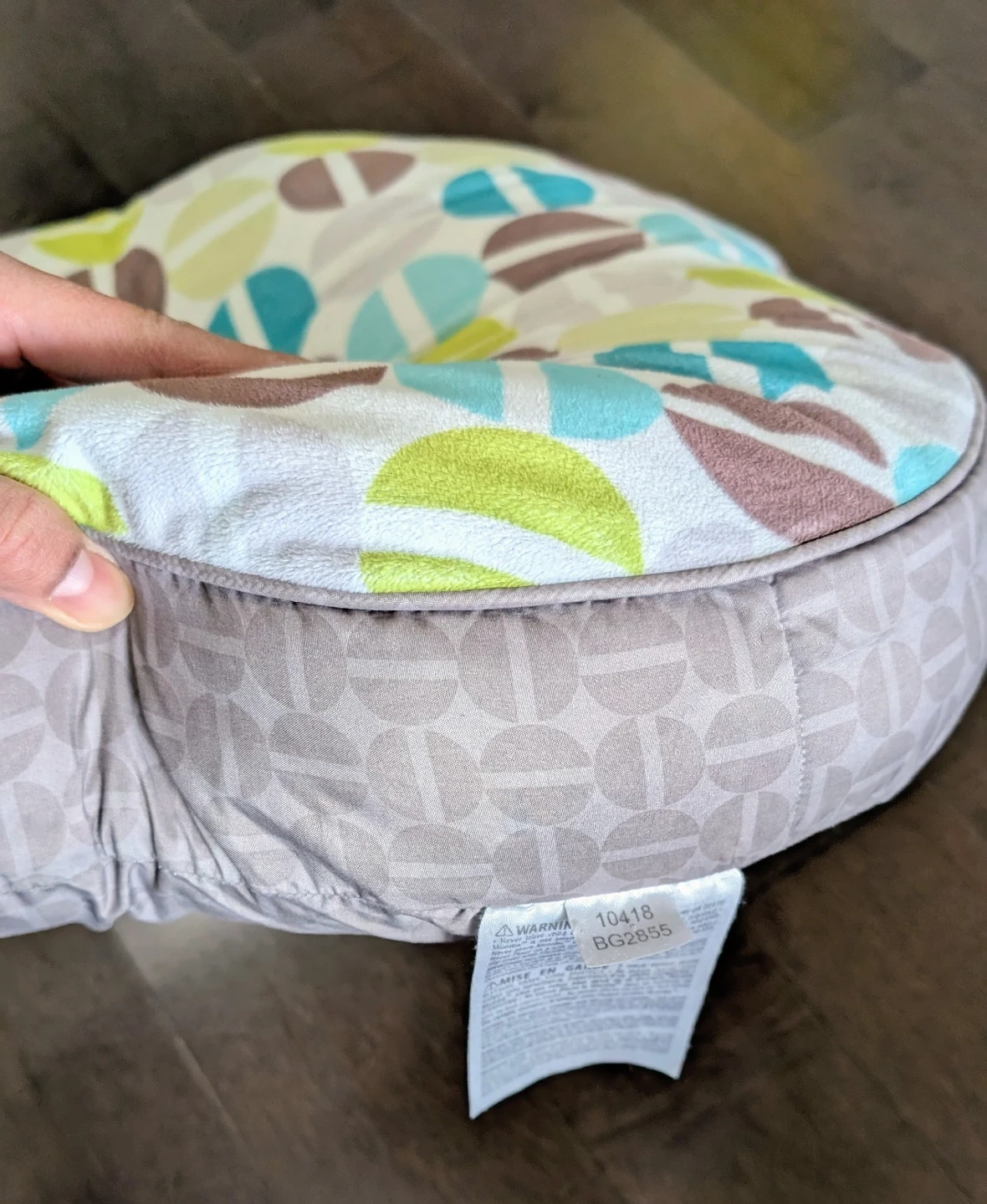 A comfy nursing pillow with a patterned cover. It's great for supporting babies during feeding. The cover is removable for easy cleaning.