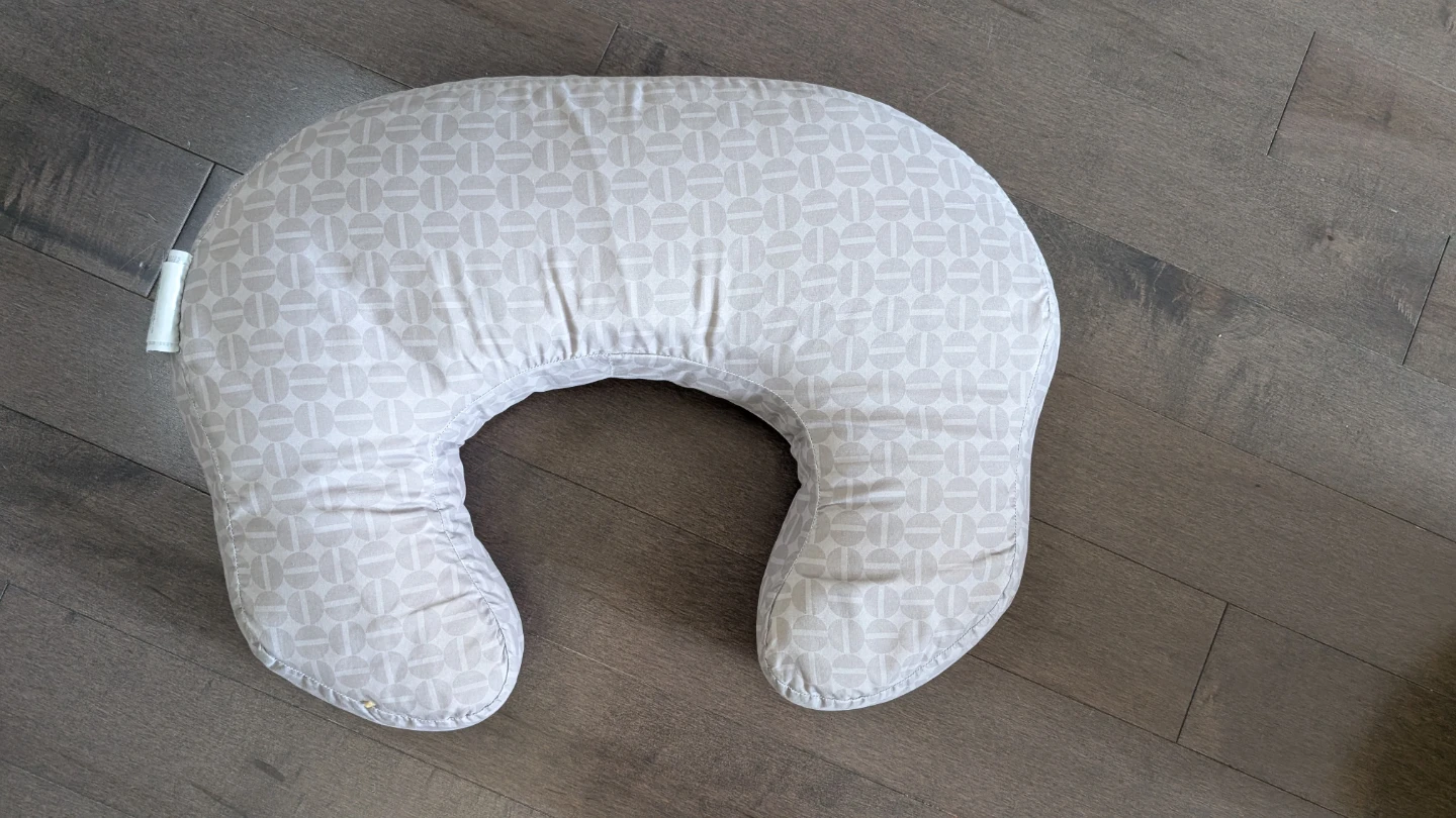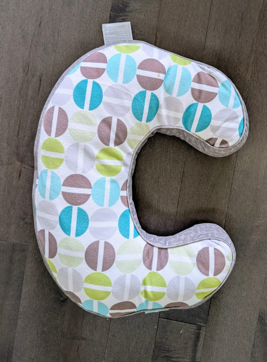 A comfy nursing pillow with a patterned cover. It's great for supporting babies during feeding. The cover is removable for easy cleaning.
