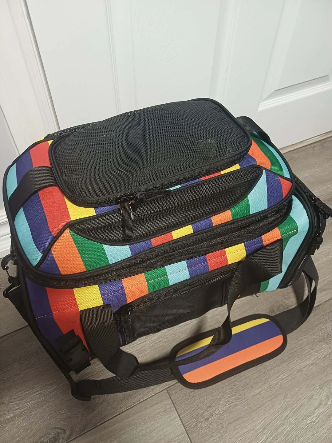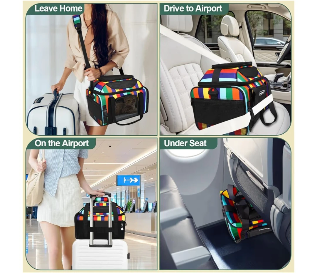 Comfortable and secure pet carrier with breathable mesh windows. Soft carrier for small dog, cat with 5-sides mesh windows. It's made with a stable metal body structure and comes with a detachable, washable soft mat. Lock zippers ensure safety during travel. This carrier is great for taking pets to the vet or on trips!