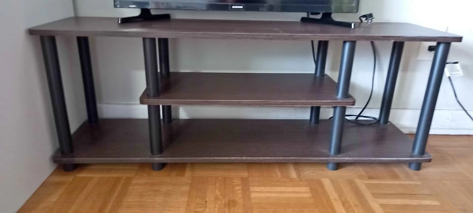 Brown TV stand with shelves. Made of MDF material. Lightweight yet sturdy. Can be disassembled but can be carried out as is. Some marks due to wear-n-tear but doesn't impact its usage. From a smoke-free, pet-free home. Pickup only.