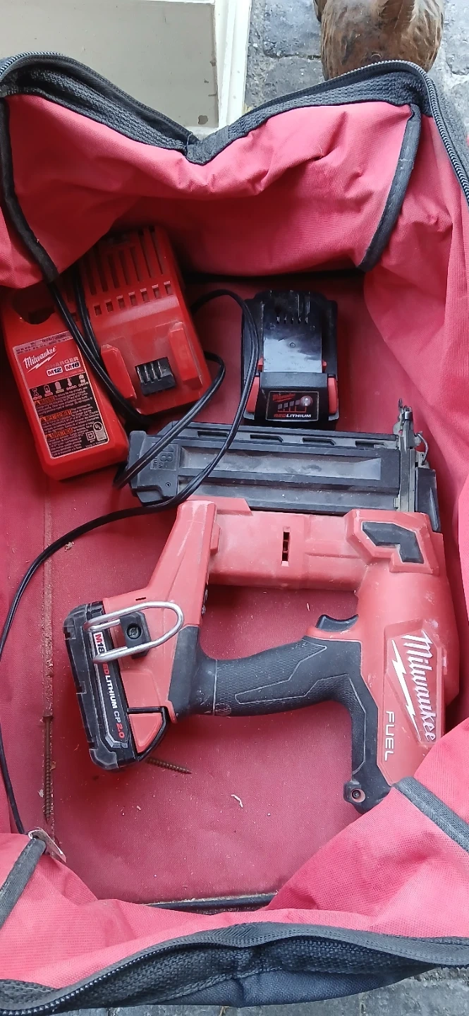 Includes a Milwaukee M18 FUEL brad nailer, two batteries (CP2.0 and M12/M18), and a charger. Everything is housed in a red Milwaukee bag. This tool is ideal for trim work and other finishing tasks.