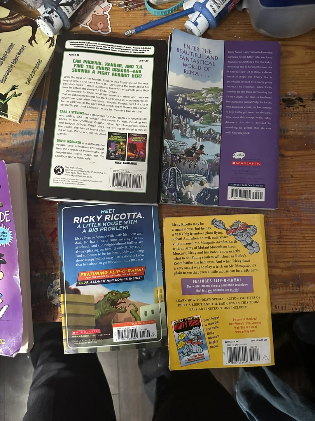 This bundle includes four children's books: 'The Battle for the Dragon Temple' and 'The Rema Chronicles: Realm of the Blue Mist'. It also features two books from the Ricky Ricotta series: 'Ricky Ricotta's Mighty Robot' and 'Ricky Ricotta vs. the Mutant Mosquitoes from Mercury'. Great for young readers interested in adventure and science fiction!