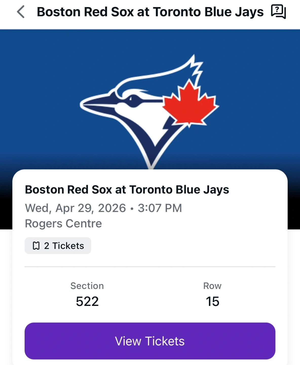 Boston Red Sox play the Toronto Blue Jays at Rogers Centre. Game date is Wednesday, April 29, 2026, with a 3:07 PM start time. Seats are in Section 522, Row 15. Please see pictures of the seats it gives a great view.