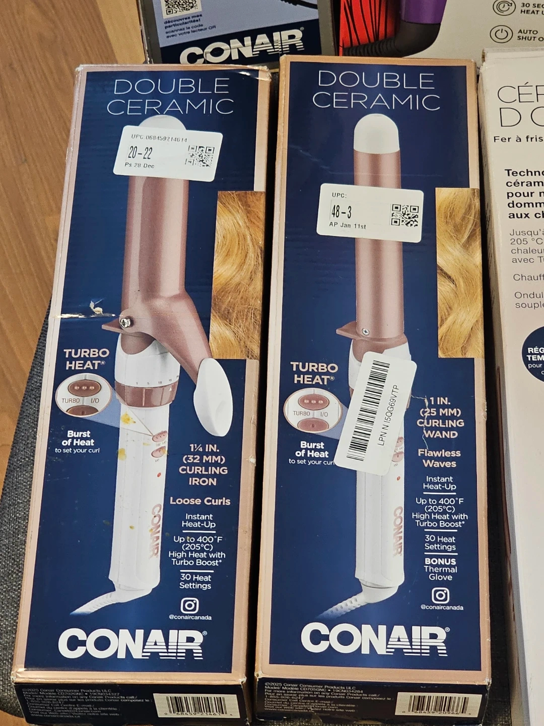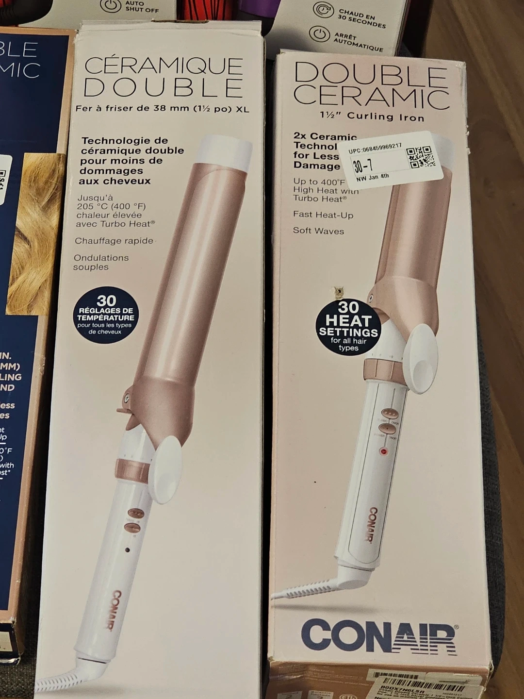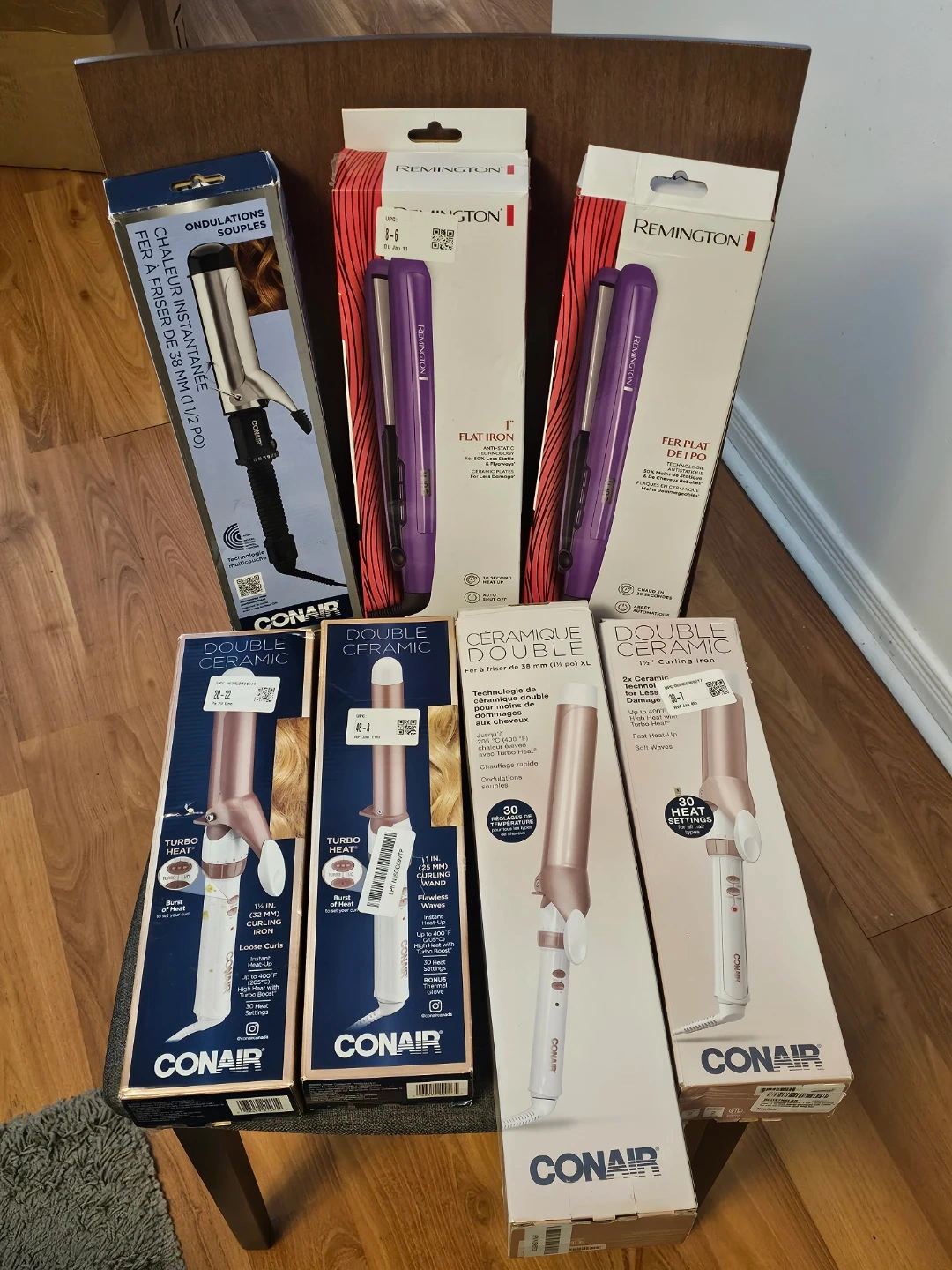 Bundle of hair styling tools including Remington flat irons and Conair curling irons and wands. Many feature Double Ceramic technology for less damage. Some are up to 400°F with 30 heat settings. Instant heat-up and Turbo Heat options available on some models.
