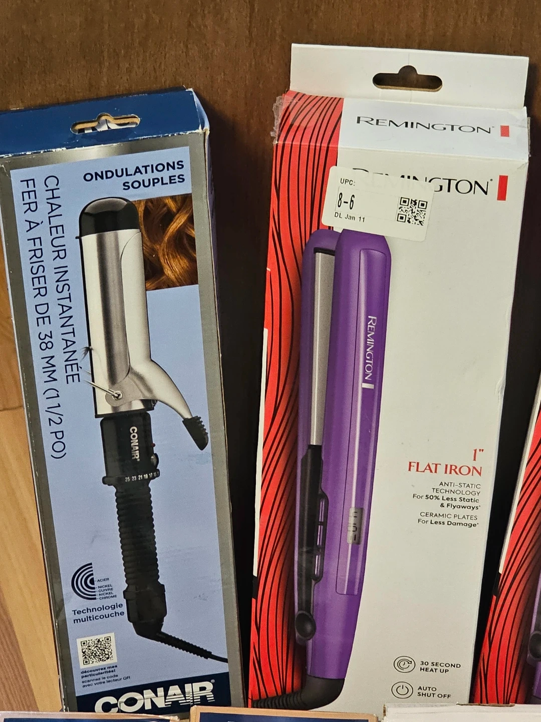Bundle of hair styling tools including Remington flat irons and Conair curling irons and wands. Many feature Double Ceramic technology for less damage. Some are up to 400°F with 30 heat settings. Instant heat-up and Turbo Heat options available on some models.