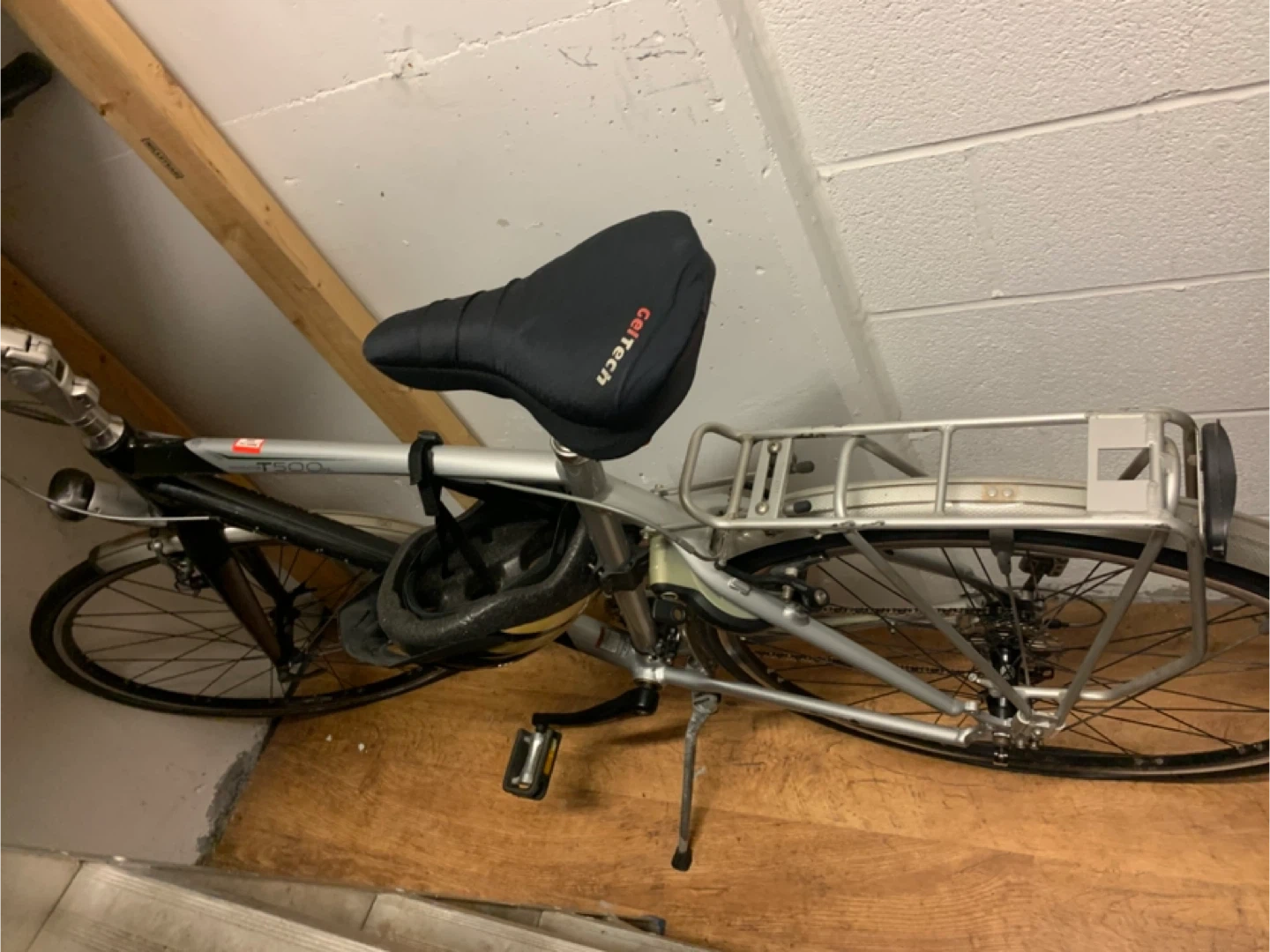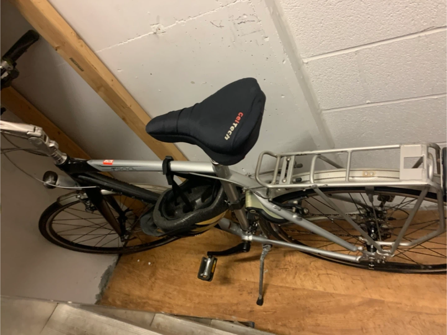 This is a DUTCH bicycle Trek Navigator T500SL hybrid bicycle with a comfortable GelTech seat cover. It features a rear rack for carrying items. The frame is silver and black. This bike is great for commuting or recreational rides!