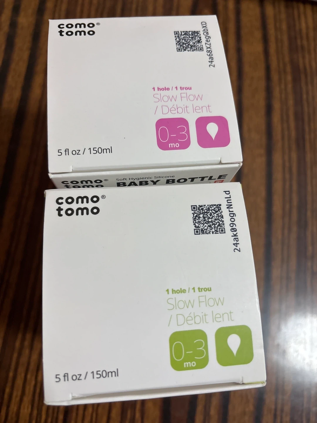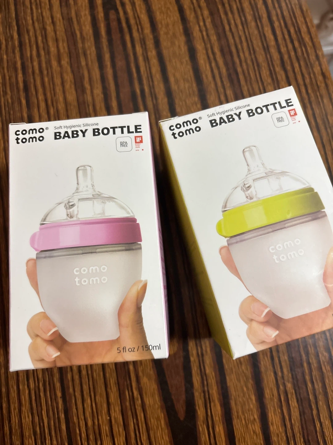 Two Como Tomo baby bottles, 5 oz each. They're slow flow, perfect for newborns 0-3 months. Made from soft, hygienic silicone. Includes original packaging.