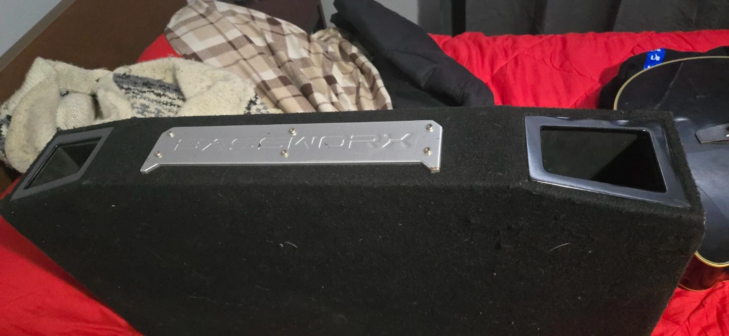 This is a Bassworx dual 12 inch subwoofer box. It's constructed with durable material and has terminal cups for easy hookup. This enclosure is ready to house your subwoofers for enhanced car audio!