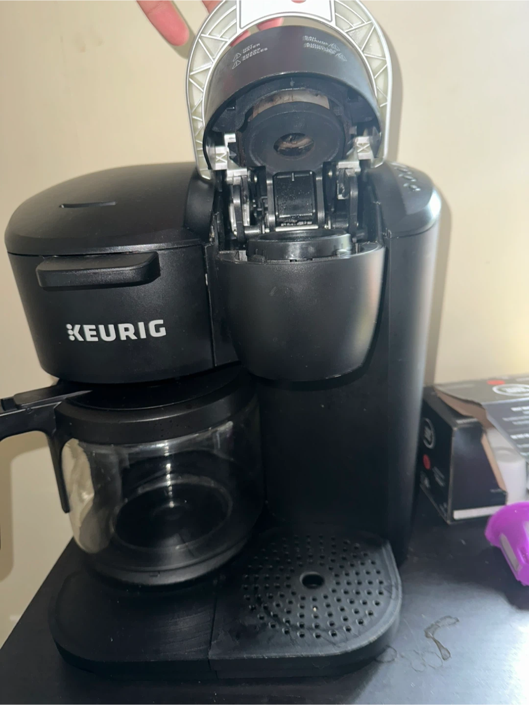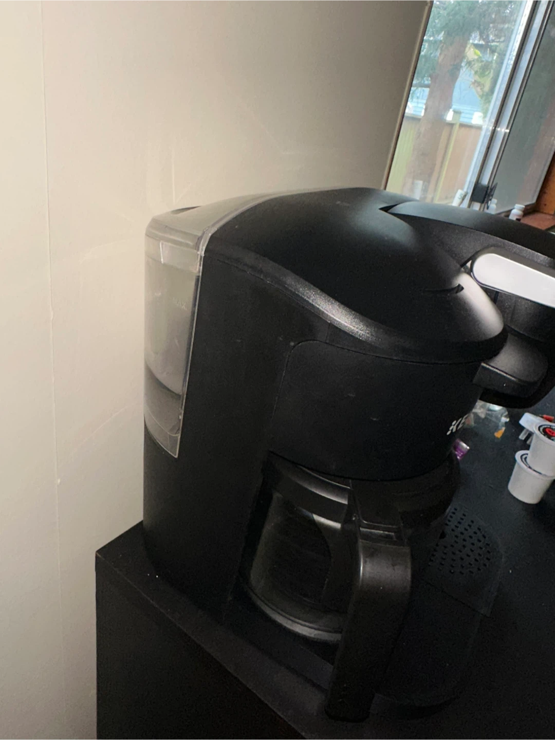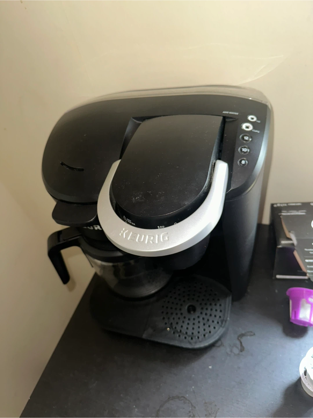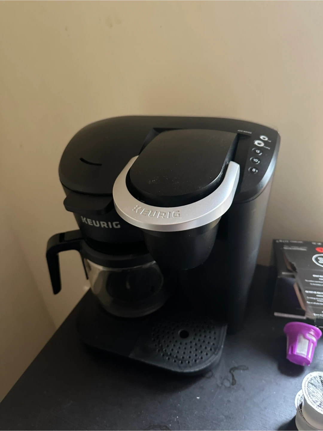 This is a Keurig coffee maker with a carafe and K-cup brewing option. It's black and has multiple brew size settings. Includes reusable K-cup filter.