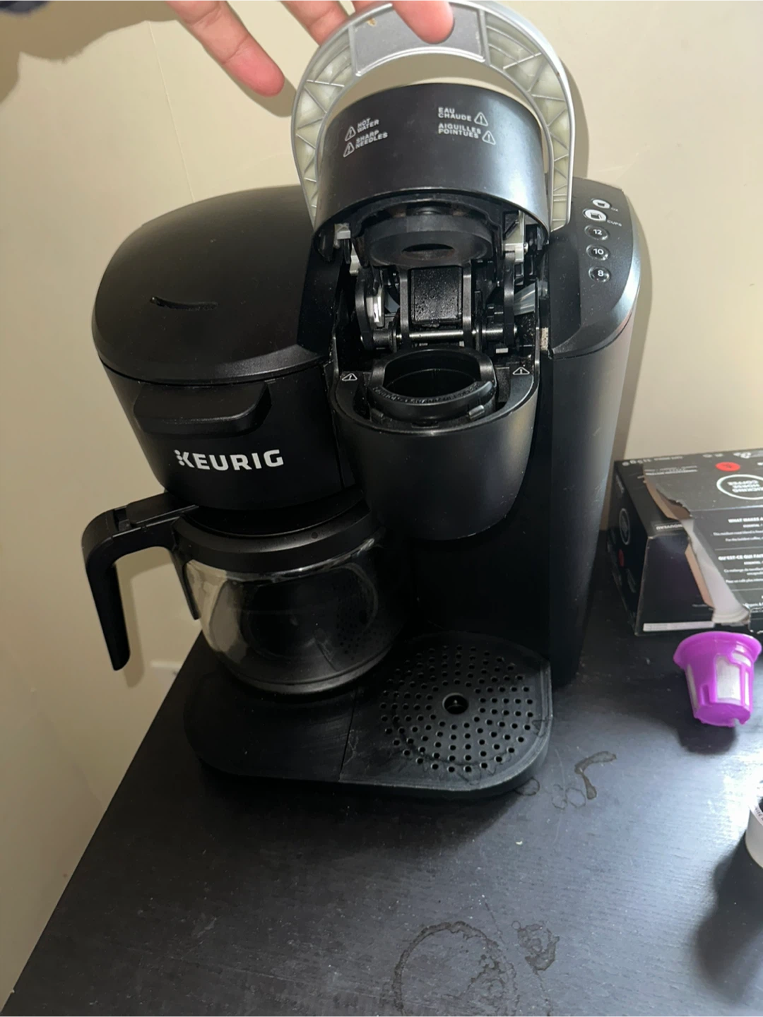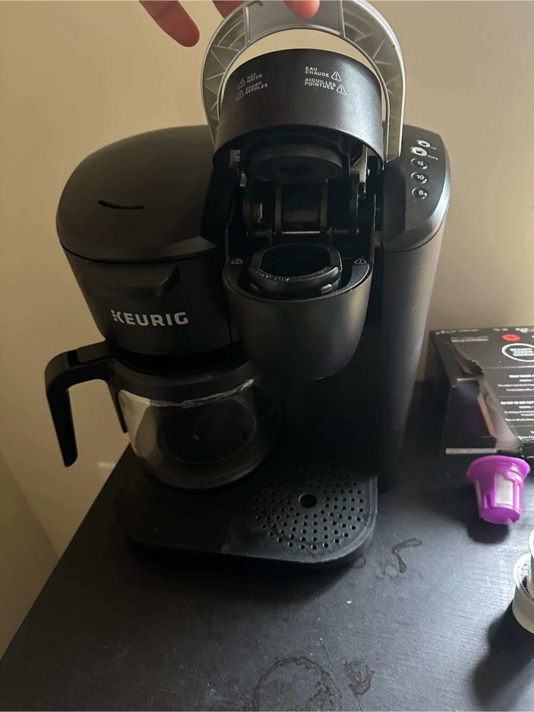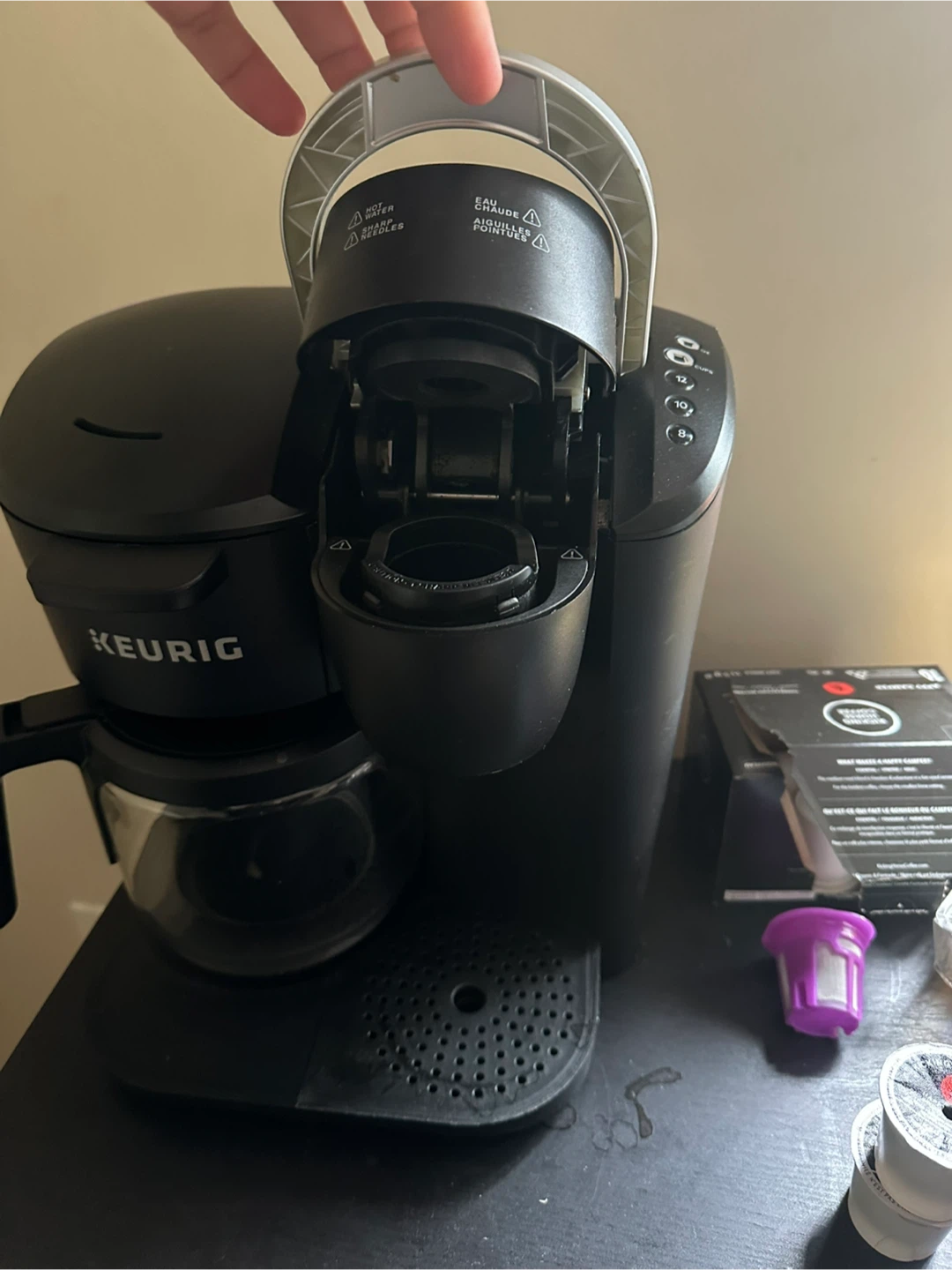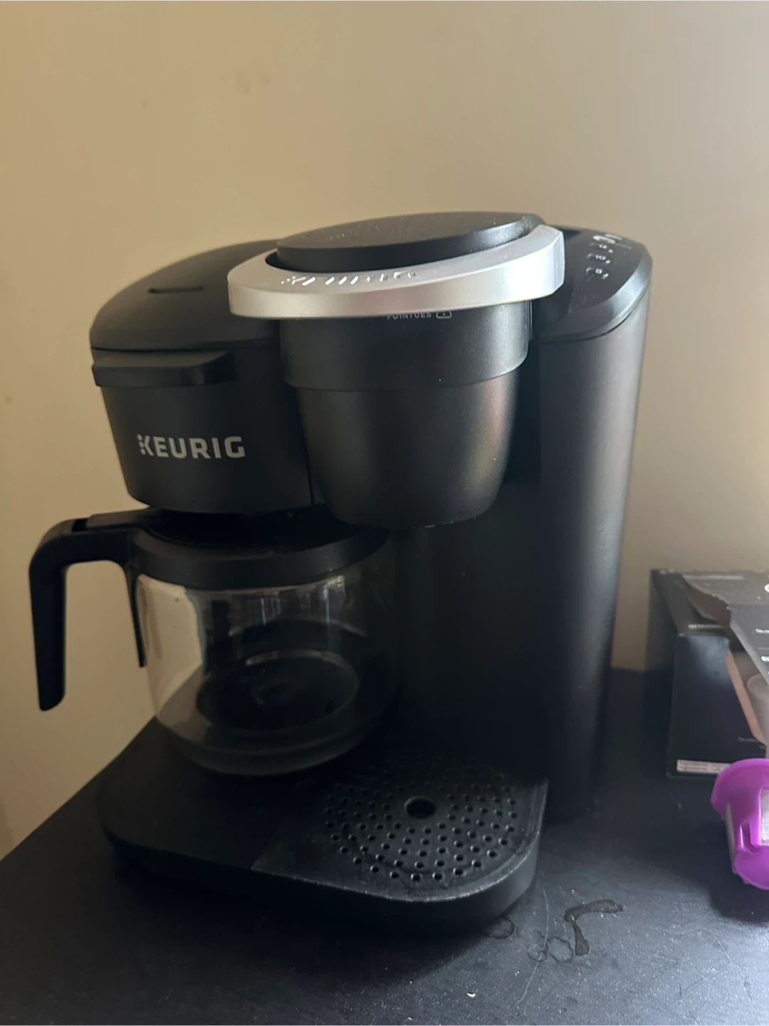 This is a Keurig coffee maker with a carafe and K-cup brewing option. It's black and has multiple brew size settings. Includes reusable K-cup filter.