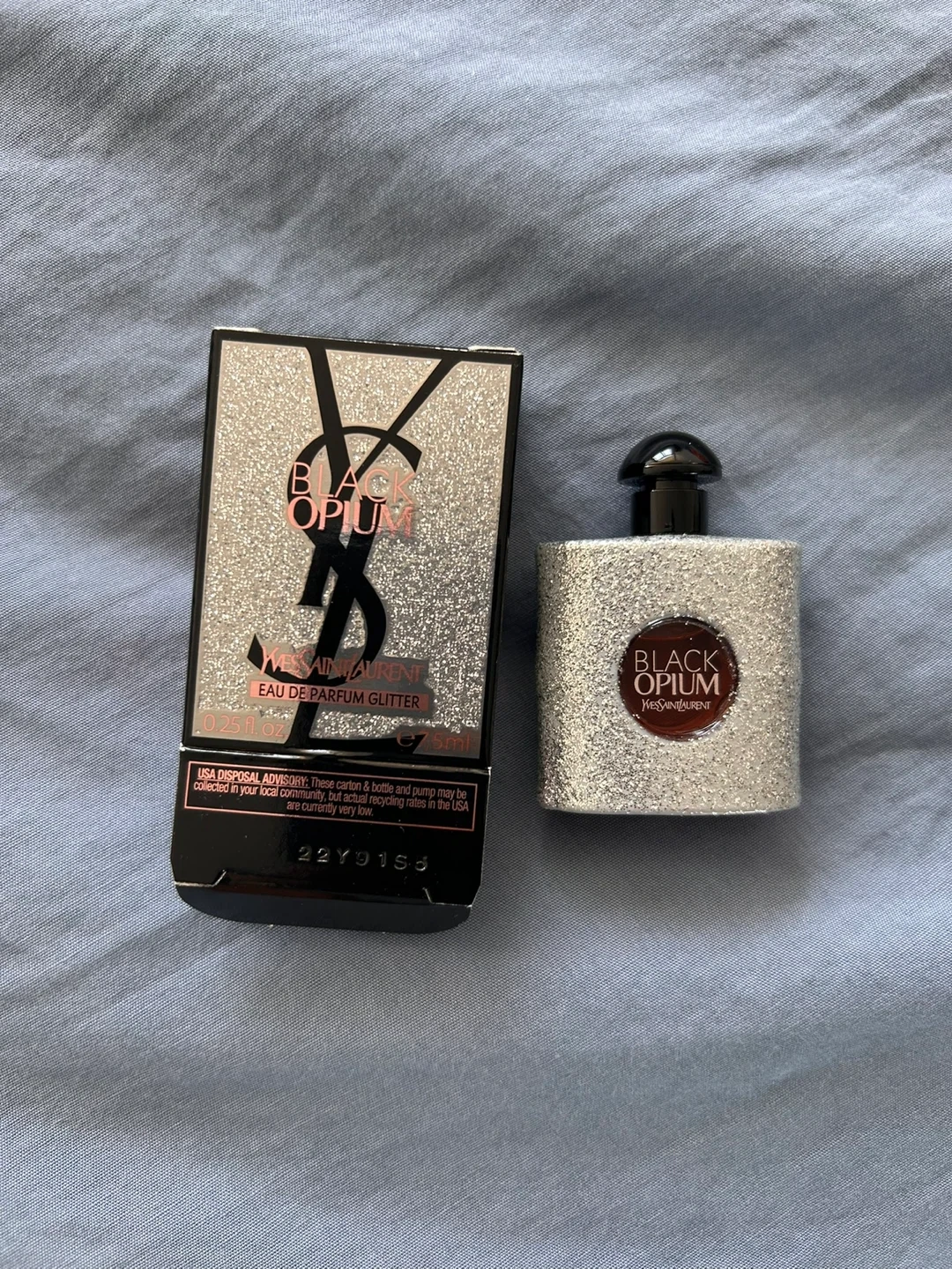 15Selling a Yves Saint Laurent Black Opium Eau de Parfum Glitter. It's 0.25 fl oz / 7.5 ml. The manufacturing date is 2022 September 15