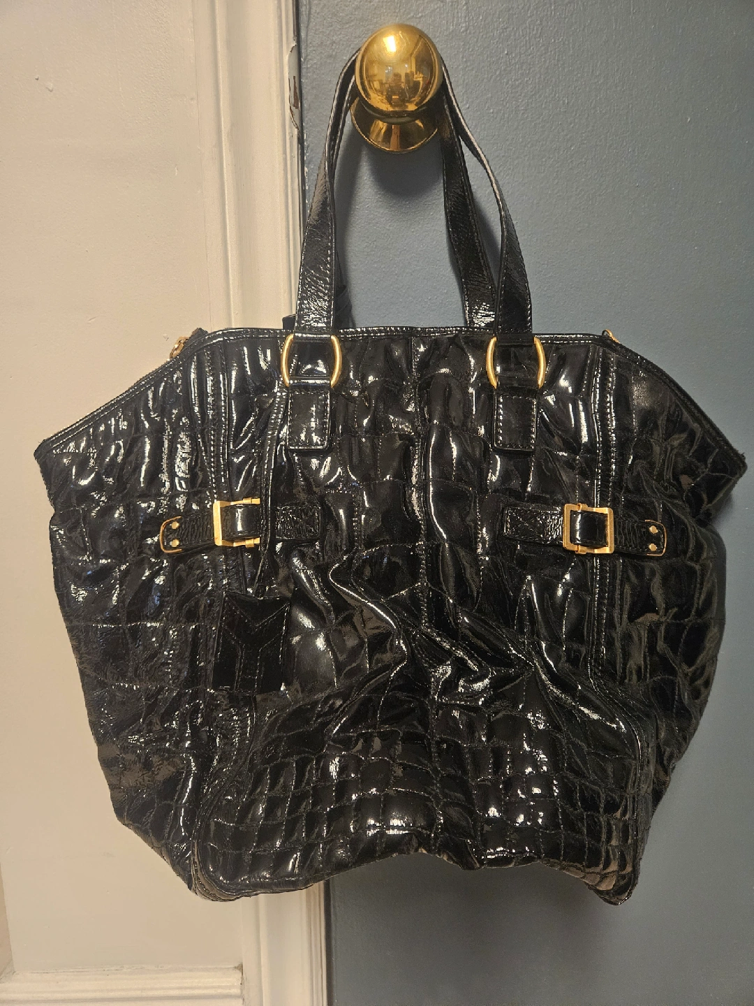 10Here's a stylish Yves Saint Laurent tote bag! It features a black patent leather exterior with gold-tone hardware. Perfect for adding a touch of luxury to your everyday look
