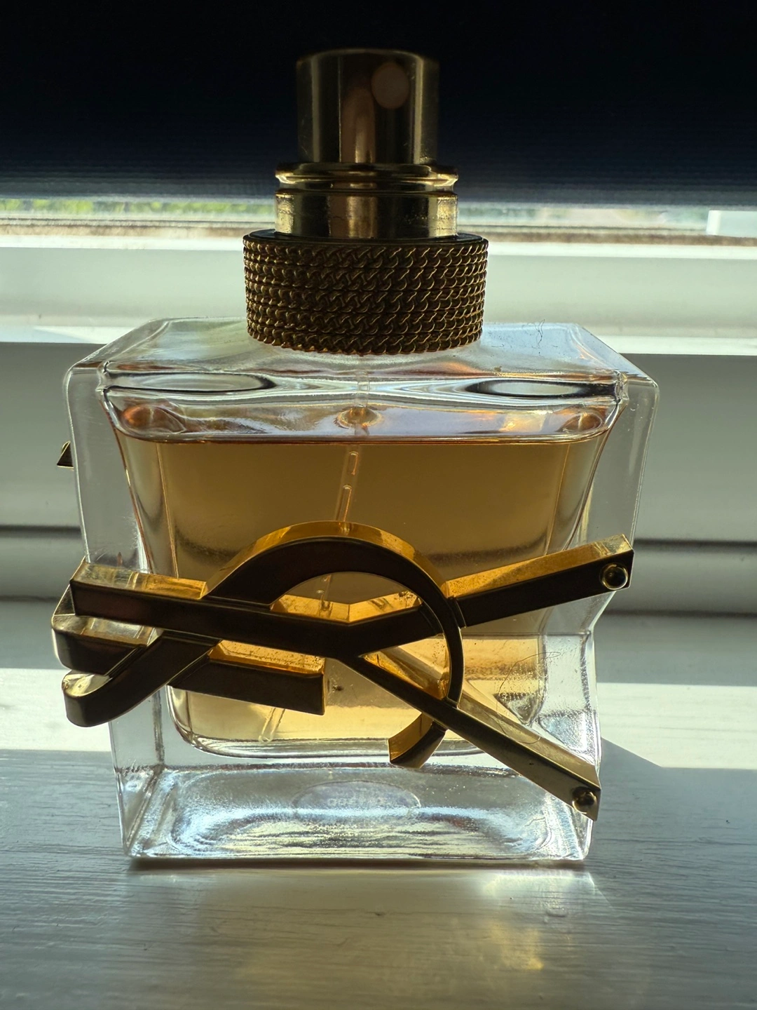 Clear, square perfume bottle. Golden accents, including the cap and the brand logo. It's a lovely item to keep on your vanity to add a touch of elegance to your day.
