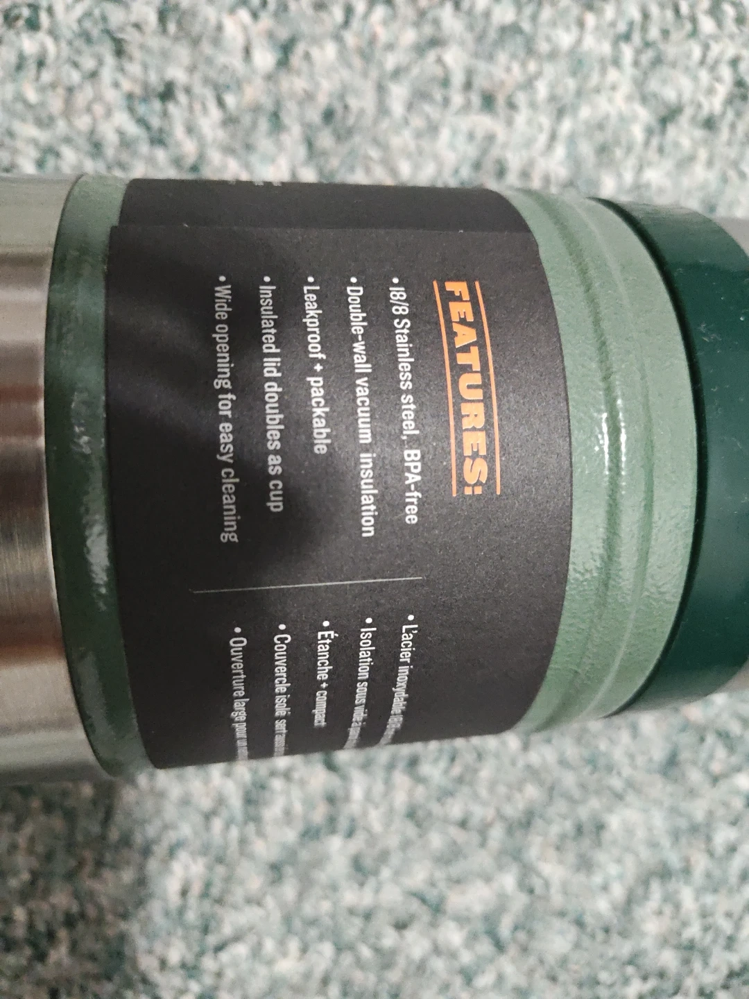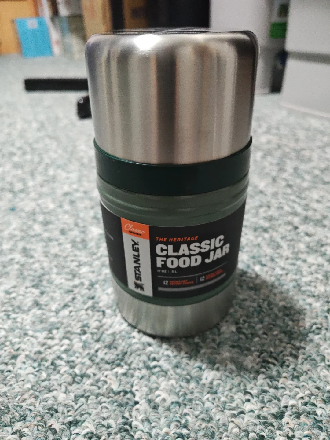 Stanley Classic Food Jar in green and silver. Made with 18/8 Stainless Steel and BPA-free materials. It features double-wall vacuum insulation and a leakproof, packable design. The insulated lid doubles as a cup, and it has a wide opening for easy cleaning.