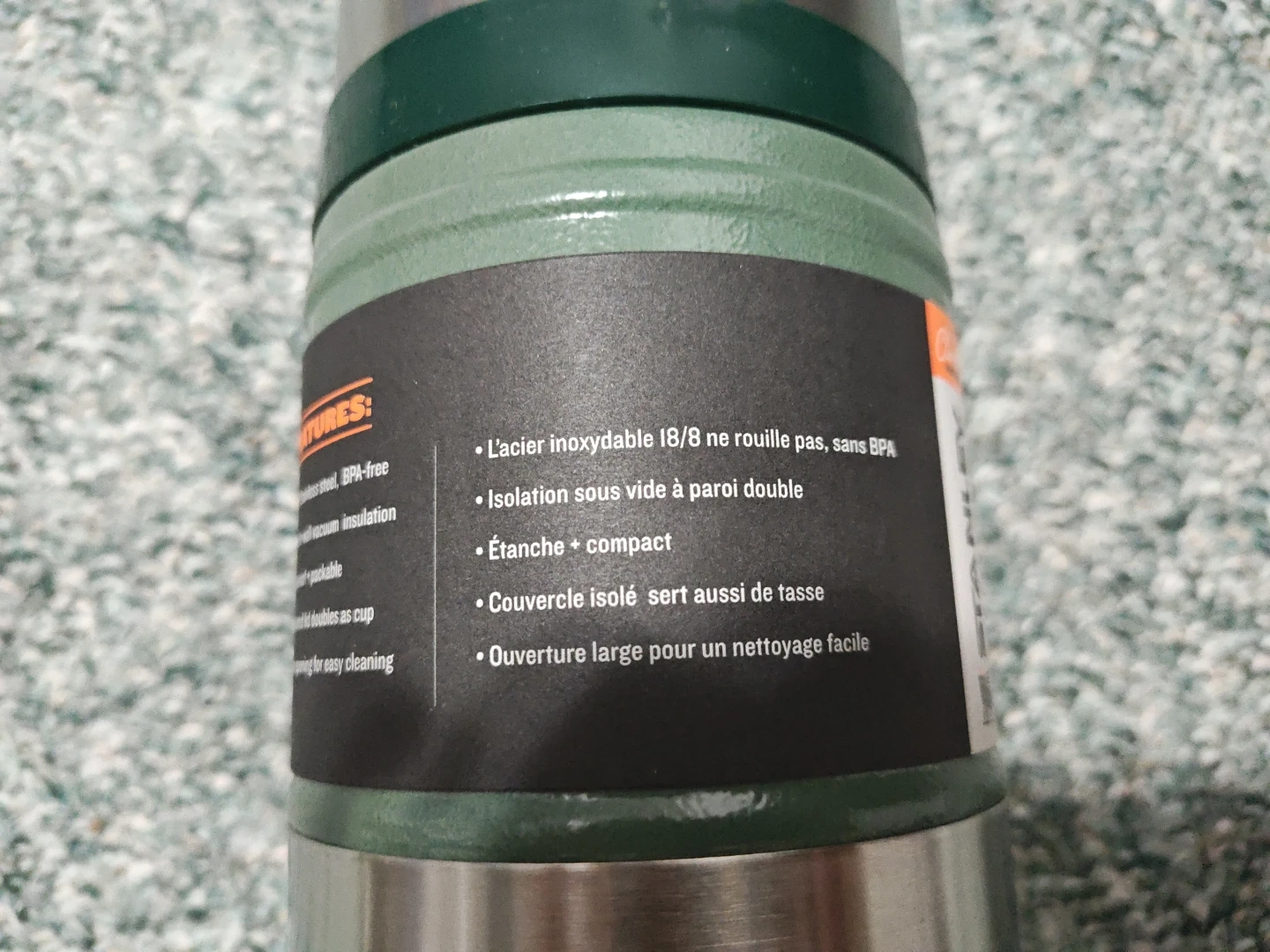 Stanley Classic Food Jar in green and silver. Made with 18/8 Stainless Steel and BPA-free materials. It features double-wall vacuum insulation and a leakproof, packable design. The insulated lid doubles as a cup, and it has a wide opening for easy cleaning.