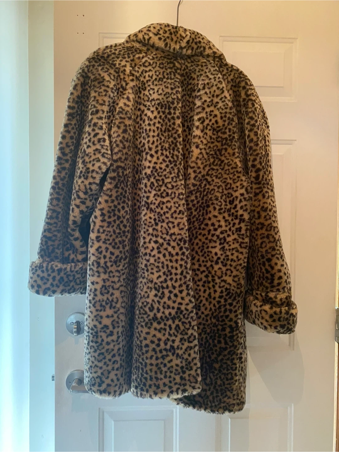 Here's a fun and stylish faux fur coat with a leopard print! It's perfect for adding a bit of flair to your wardrobe and keeping warm on chilly days