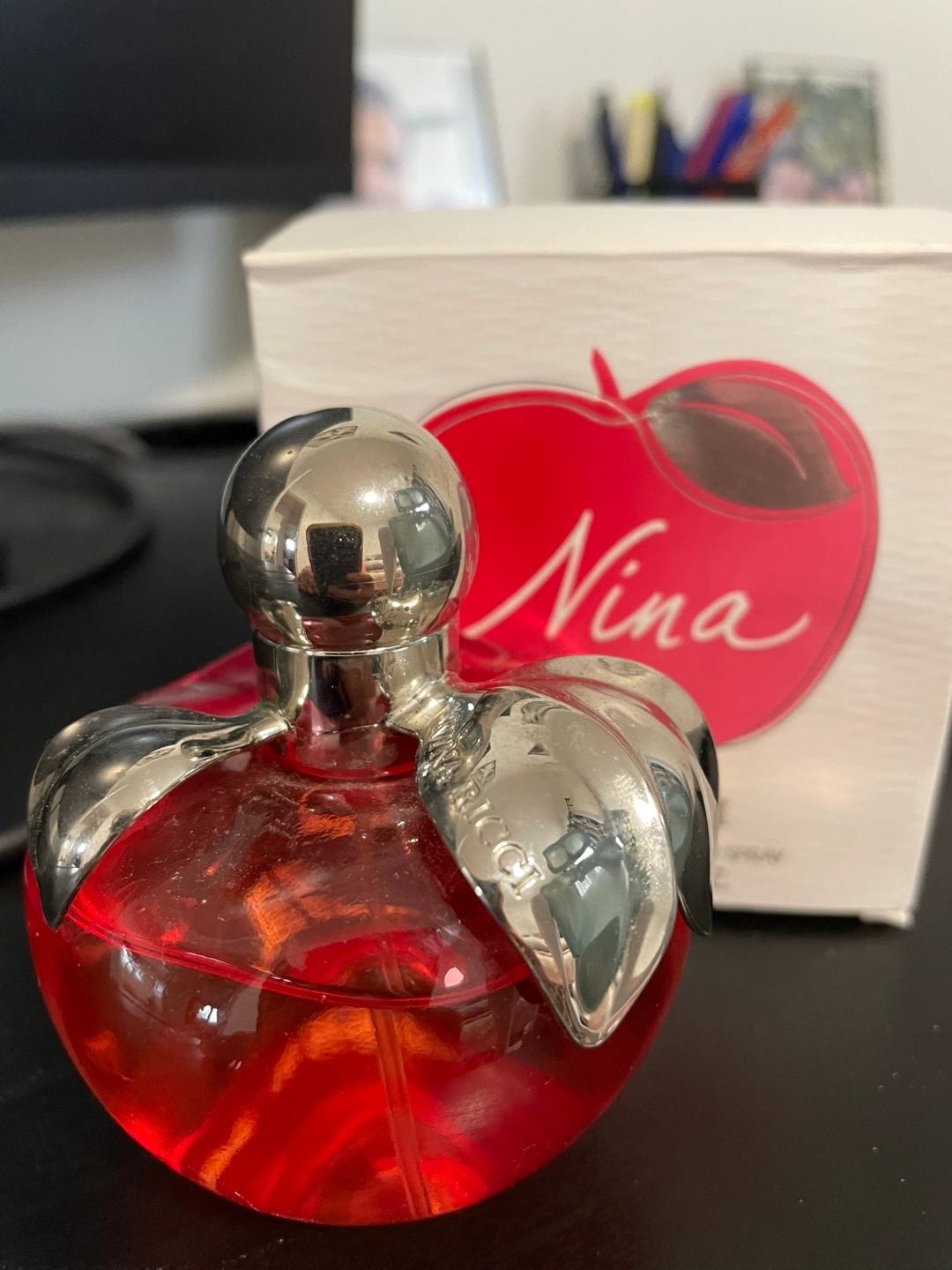 Selling a bottle of Nina Ricci Nina Eau de Toilette. It's a lovely fragrance in an 80ml bottle. The bottle is shaped like a red apple with silver leaves, so cute! Comes with the original box too. Perfect for anyone who loves a sweet and floral scent. Pickup only.