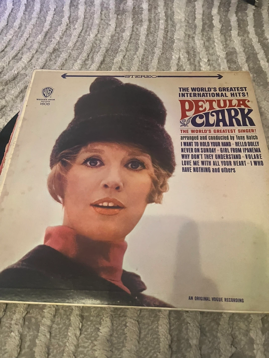 This is Petula Clark's "The World's Greatest International Hits" vinyl record. It's an original Vogue Recording. Includes tracks like "I Want to Hold Your Hand" and "Hello Dolly".