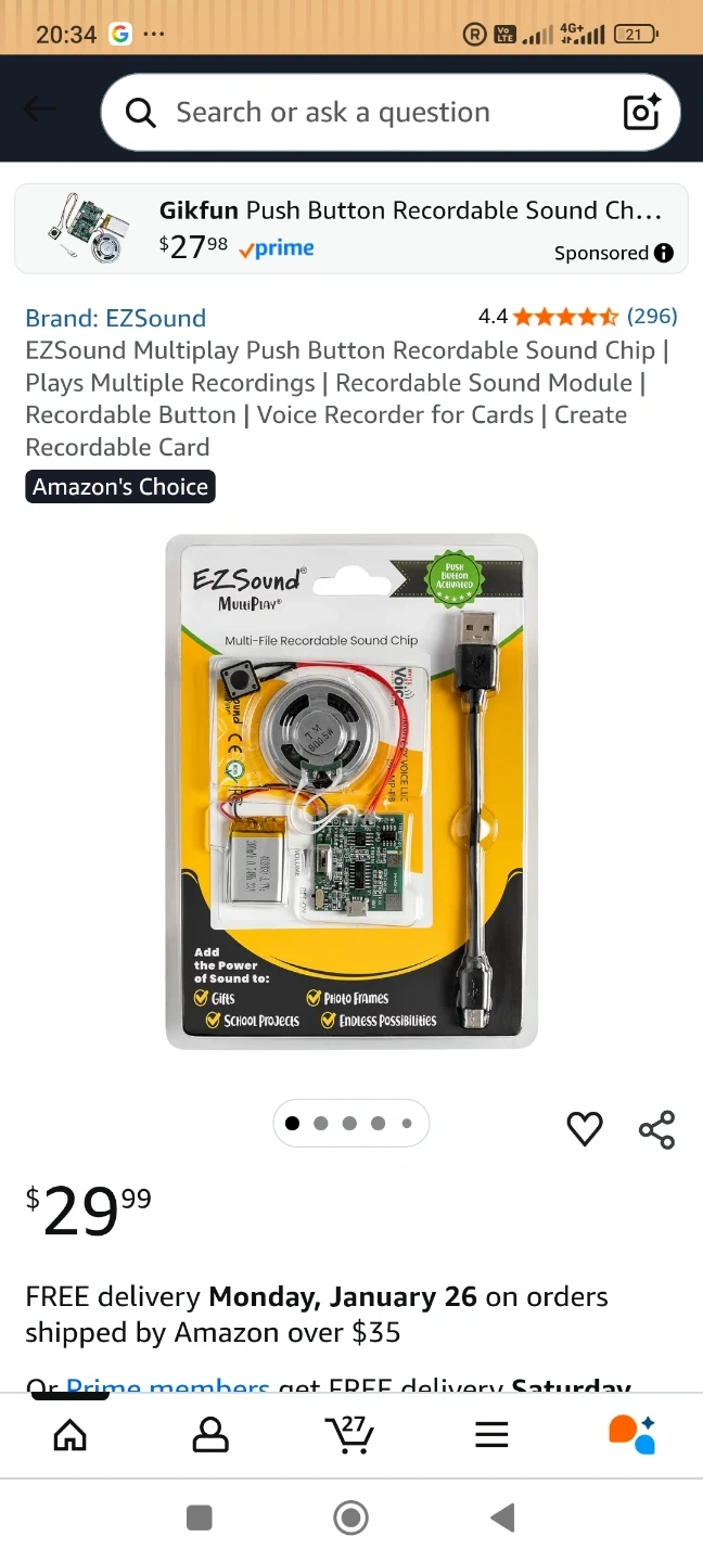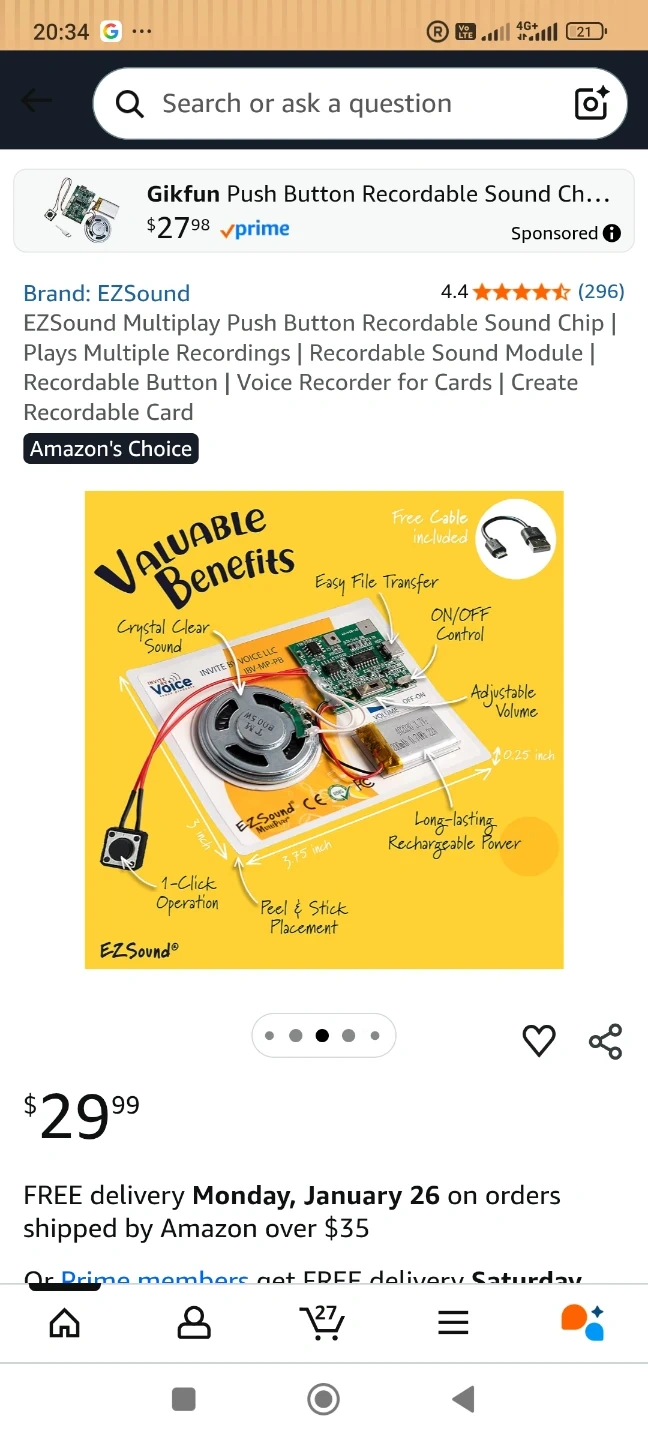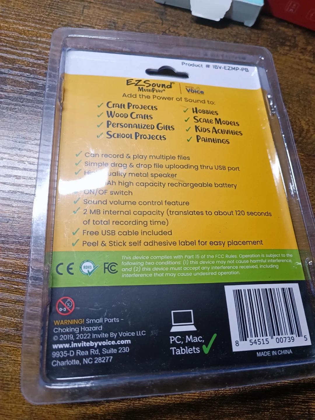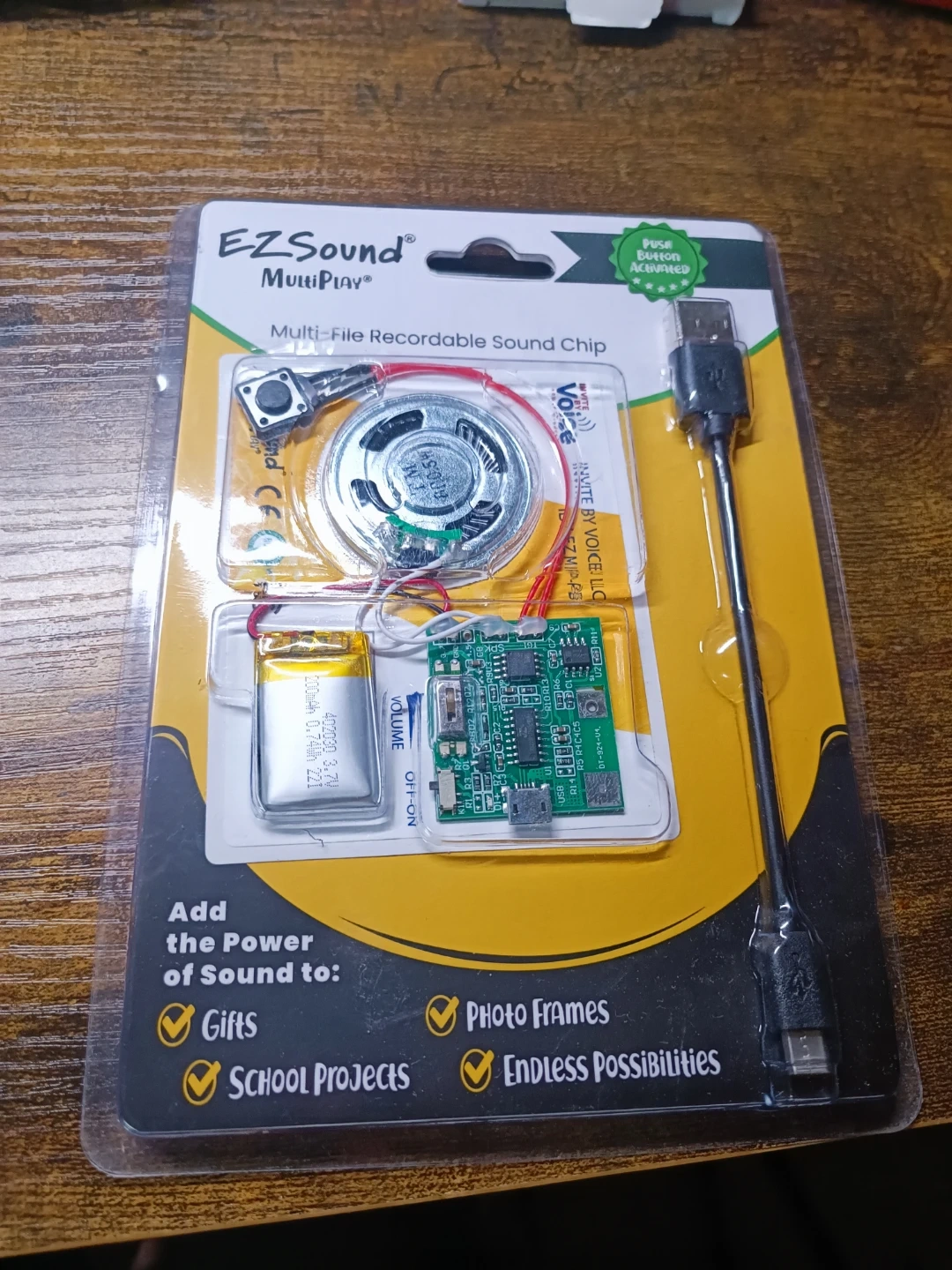 This EZSound MultiPlay module lets you record and play multiple sounds. It features a high-quality metal speaker and a rechargeable battery for long-lasting use. A free USB cable is included for easy file uploading. Peel and stick adhesive backing allows for simple placement.