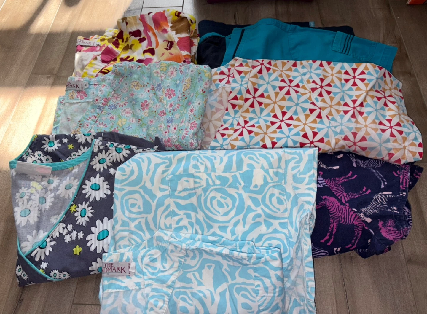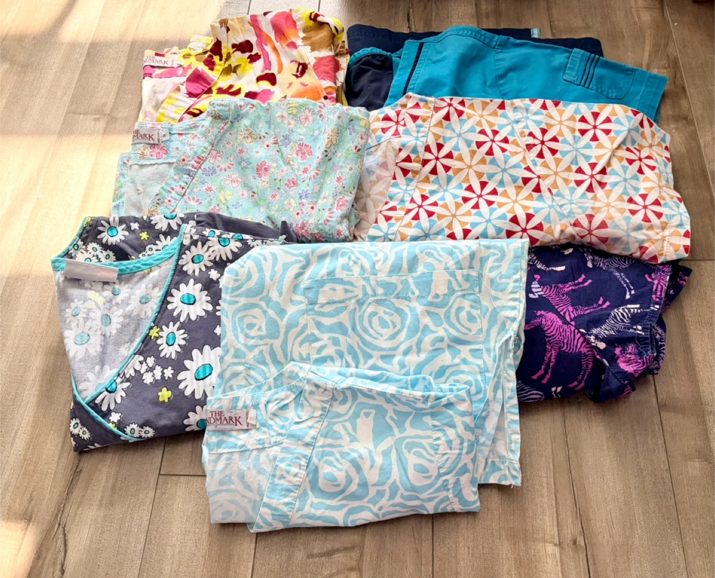 A collection of vibrant scrub tops featuring floral and geometric patterns. Includes shades of blue, pink, and yellow.