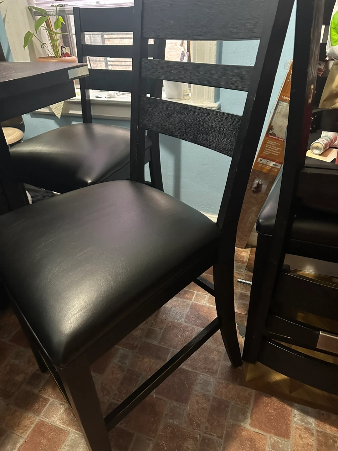 These counter height dining chairs feature black faux leather seats and a dark wood frame. They're designed to fit with most counter height tables. Sturdy construction for everyday use!