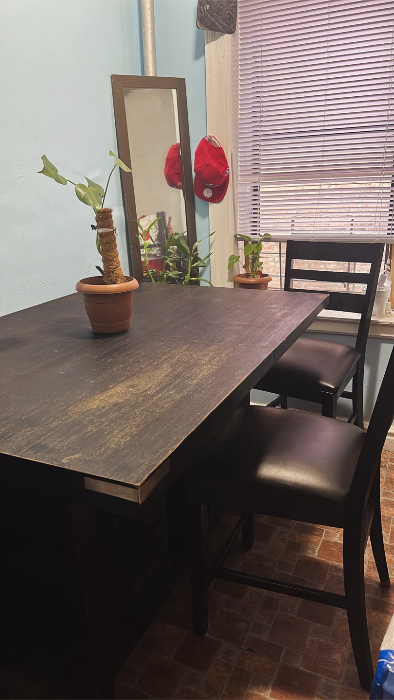 These counter height dining chairs feature black faux leather seats and a dark wood frame. They're designed to fit with most counter height tables. Sturdy construction for everyday use!