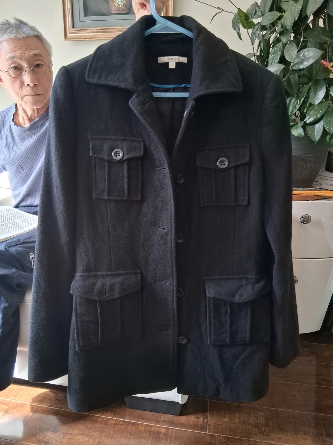 Rw&CO stylish ladies black wool blend jacket with a collared neckline and button closure. It features four front flap pockets with button accents. Excellent for cooler weather!