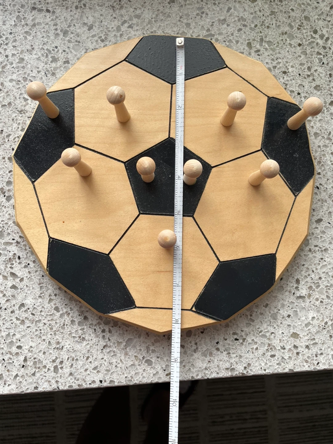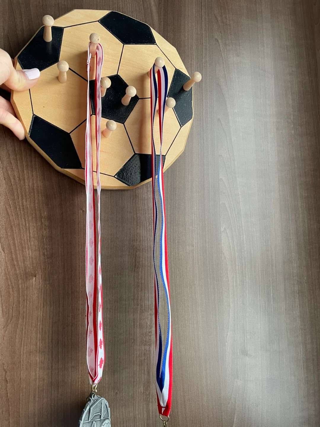 Display your soccer achievements with this wooden medallion holder. It's shaped like a soccer ball and features multiple pegs for hanging medals. The holder measures approximately 12 inches in diameter. This piece would be great for any young athlete to showcase their hard-earned awards!