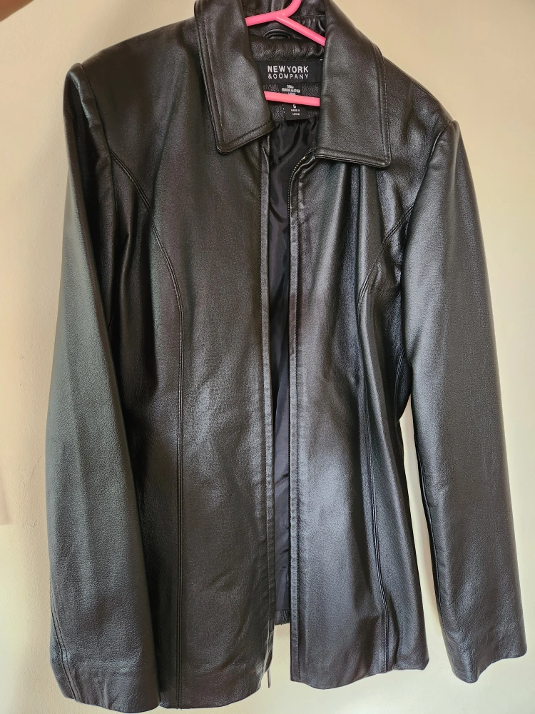 Black leather jacket with zipper closure and pockets. In great condition barely used. (vintage)