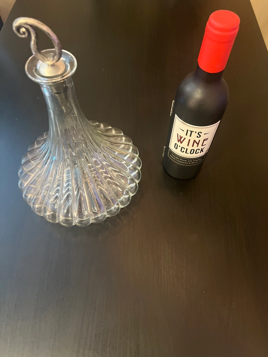 Elegant crystal wine decanter, features a unique fluted design and silver-toned stopper. Also includes a compact, two-bottle wine opener with various tools. Perfect for wine enthusiasts. $5 each