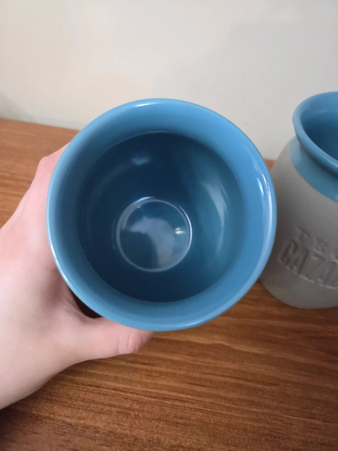 Two ceramic cups with "TEQUILA CAZADORES" embossed on them. These cups have a grey matte exterior and a blue interior glaze.