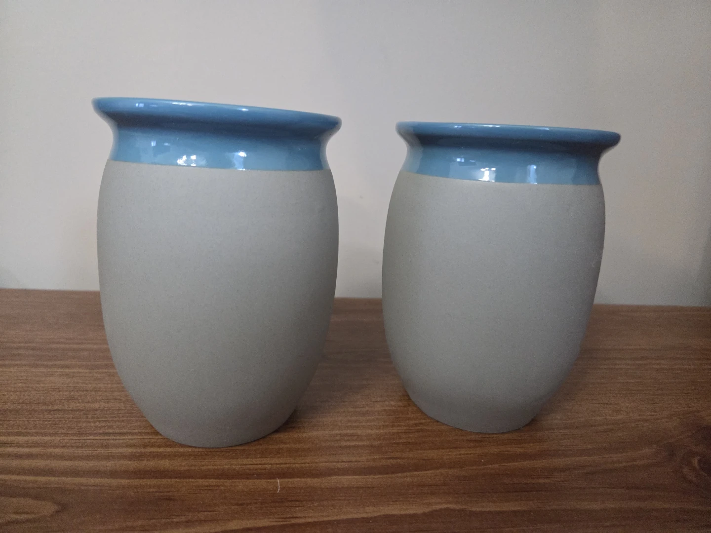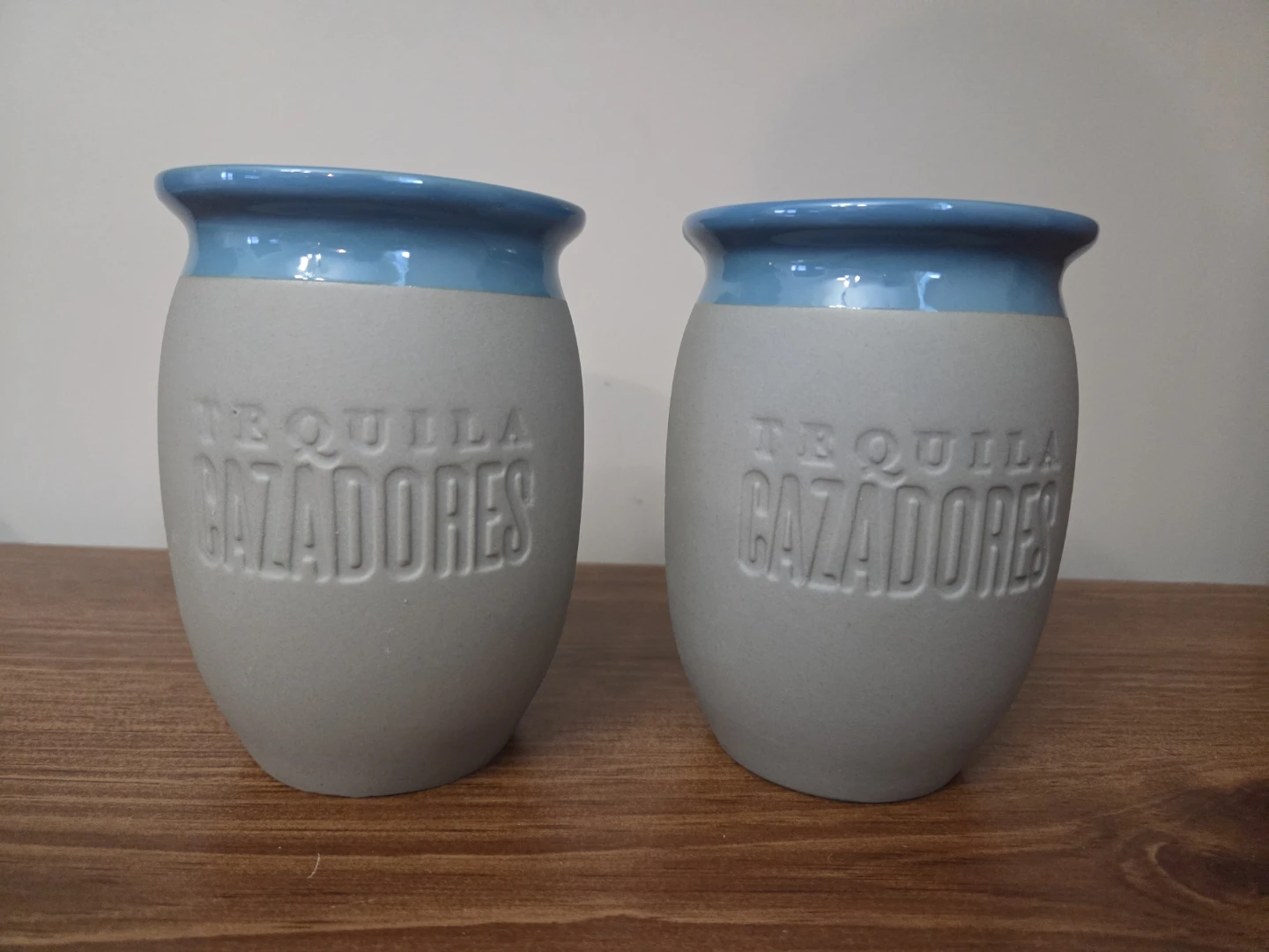 Two ceramic cups with "TEQUILA CAZADORES" embossed on them. These cups have a grey matte exterior and a blue interior glaze.