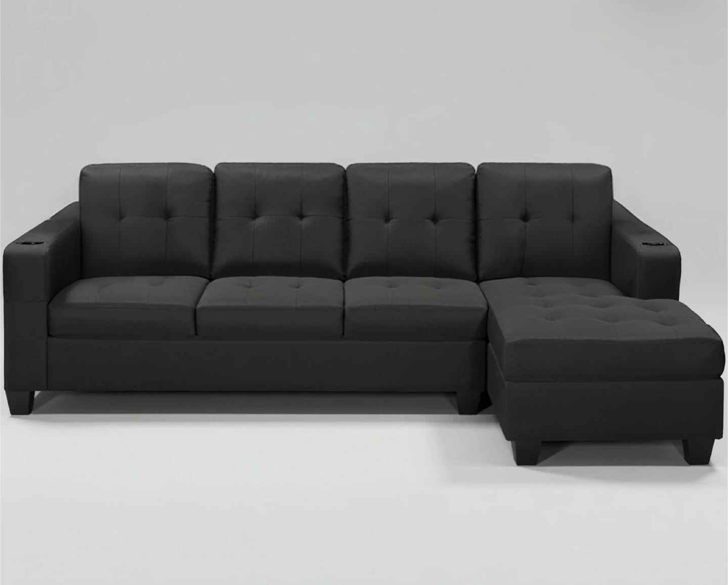 This black sectional sofa offers ample seating and is reversible to fit any living space. Purchased new, and gently used. It's designed with tufted cushions for comfort. Features built-in cup holders in the armrests. Will let go for $250 if PICKED UP TONIGHT (March 30). In Spruce Cliff.
