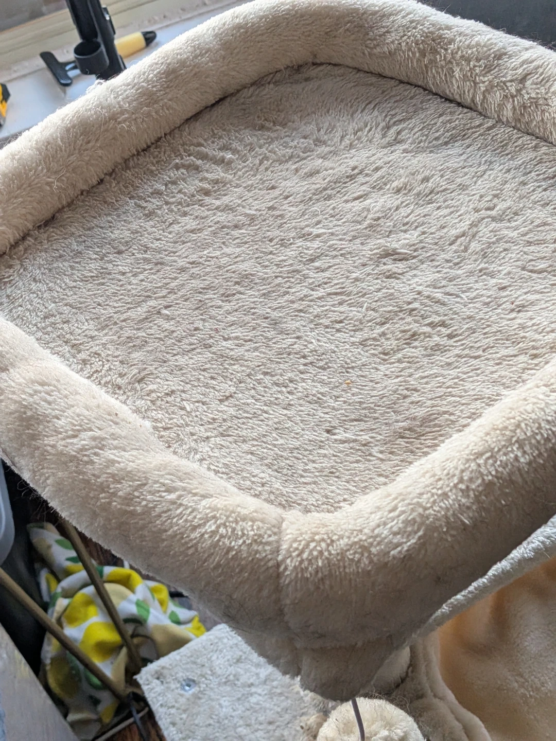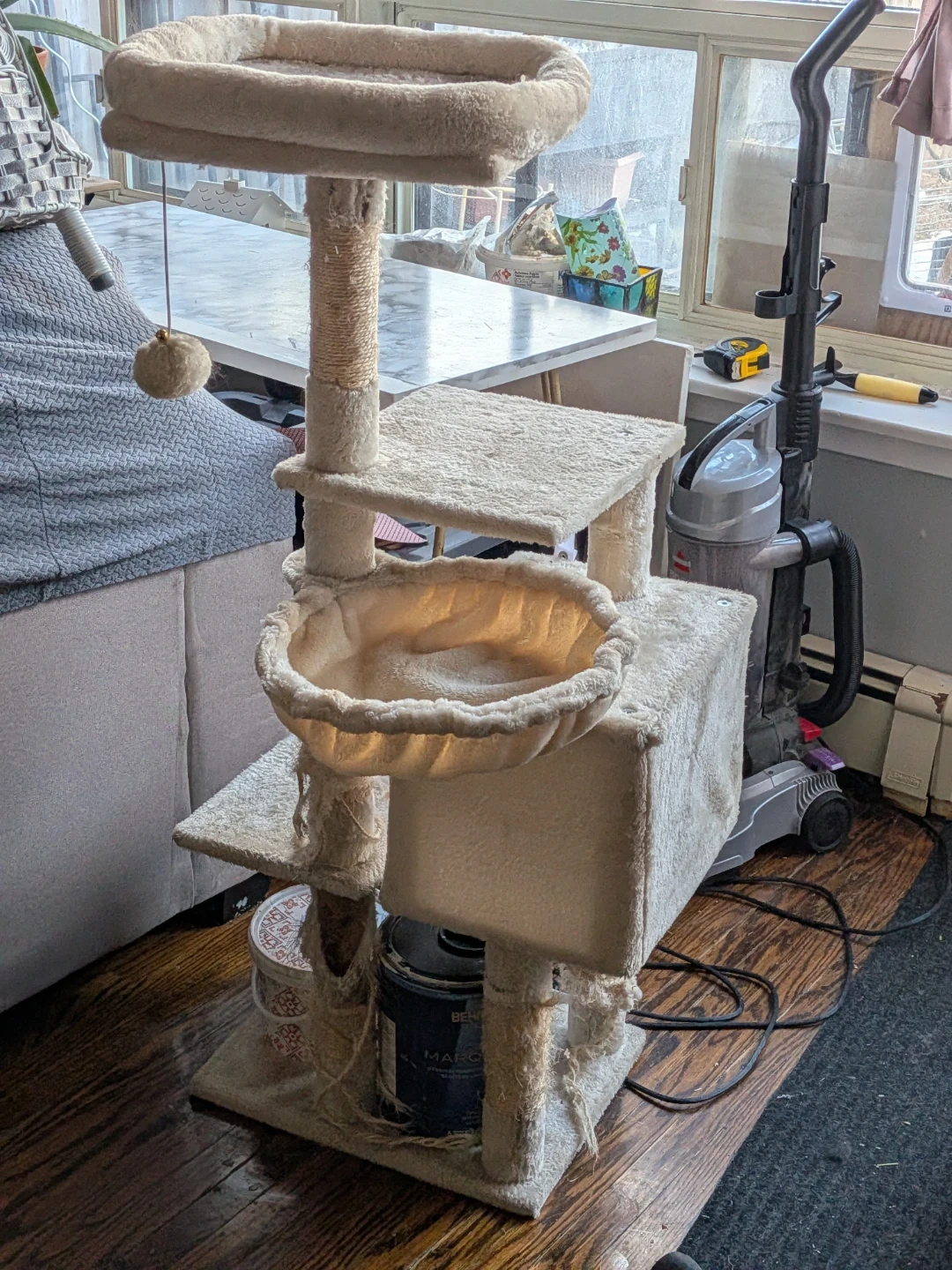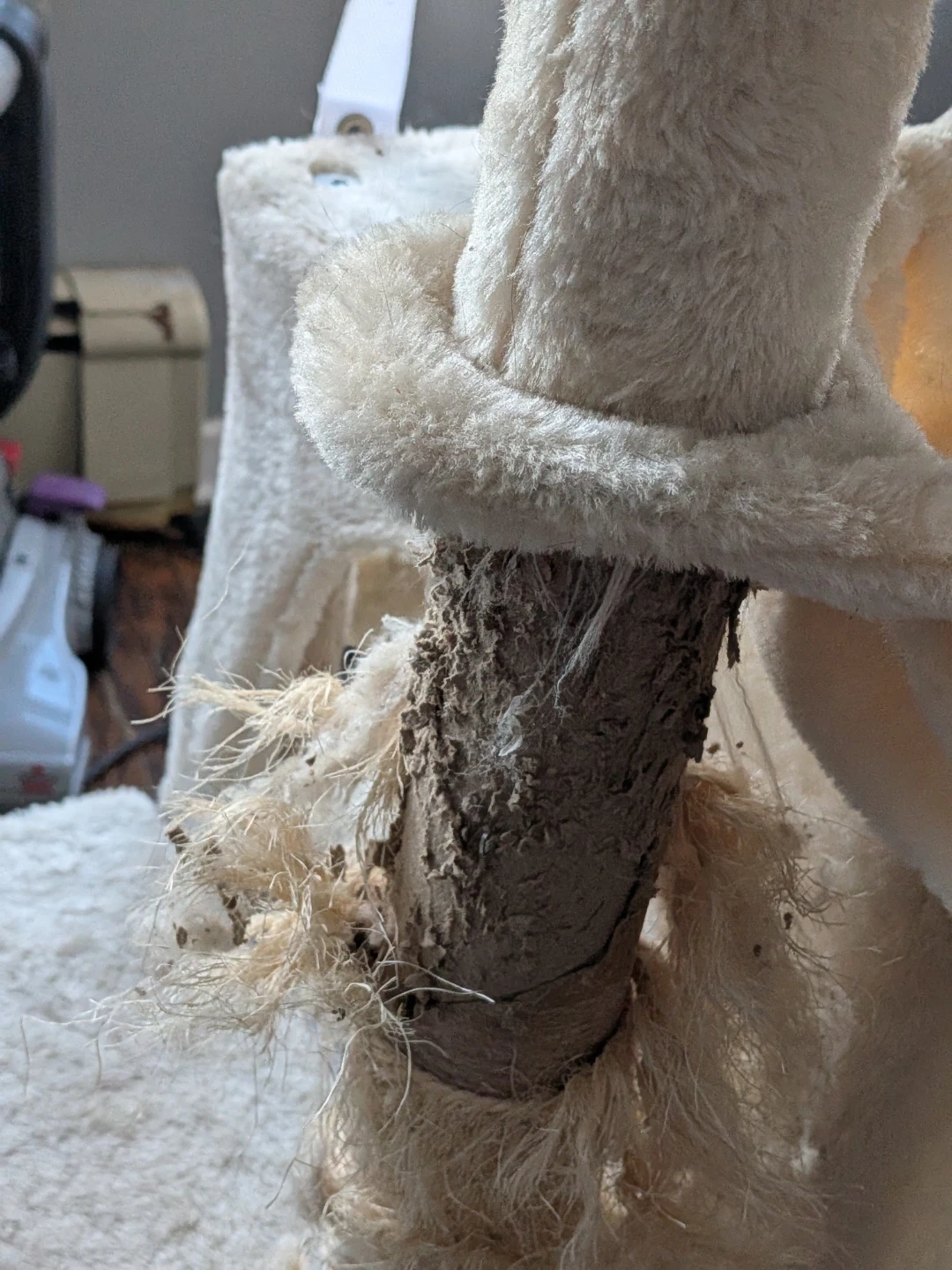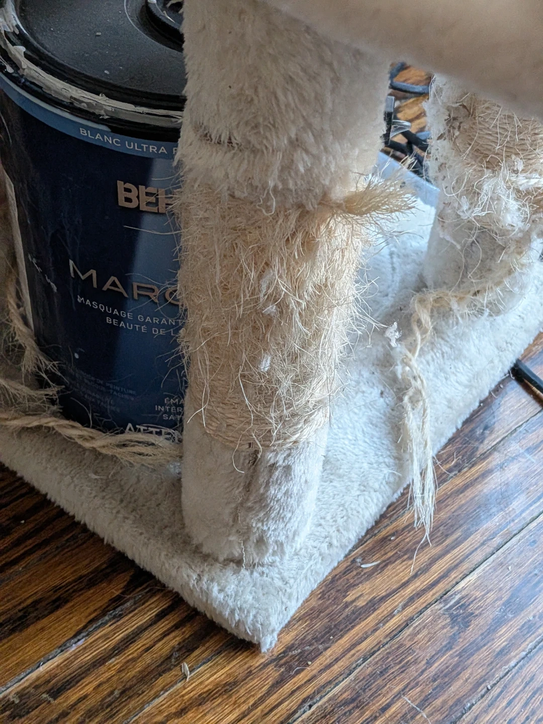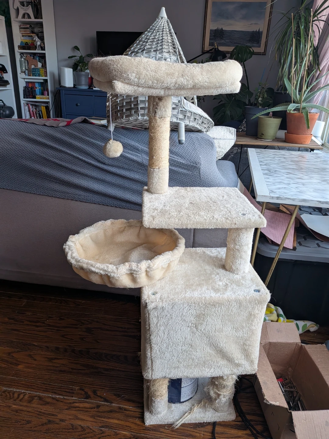 Needs re ropeing, cats have destroyed rope on some posts. Also, my cat knocks the entire tree over so have to put something heavy to secure in place. Sold AS IS