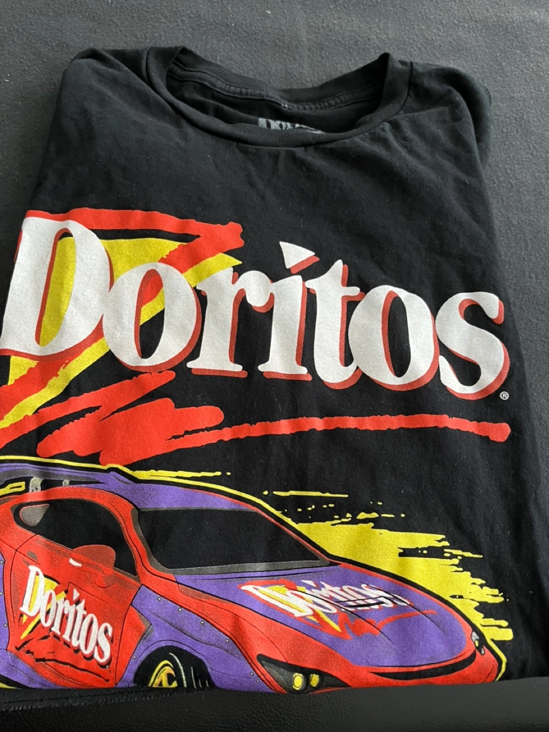 Black t-shirt featuring a graphic print of the Doritos logo with a race car design. It's made of cotton material.